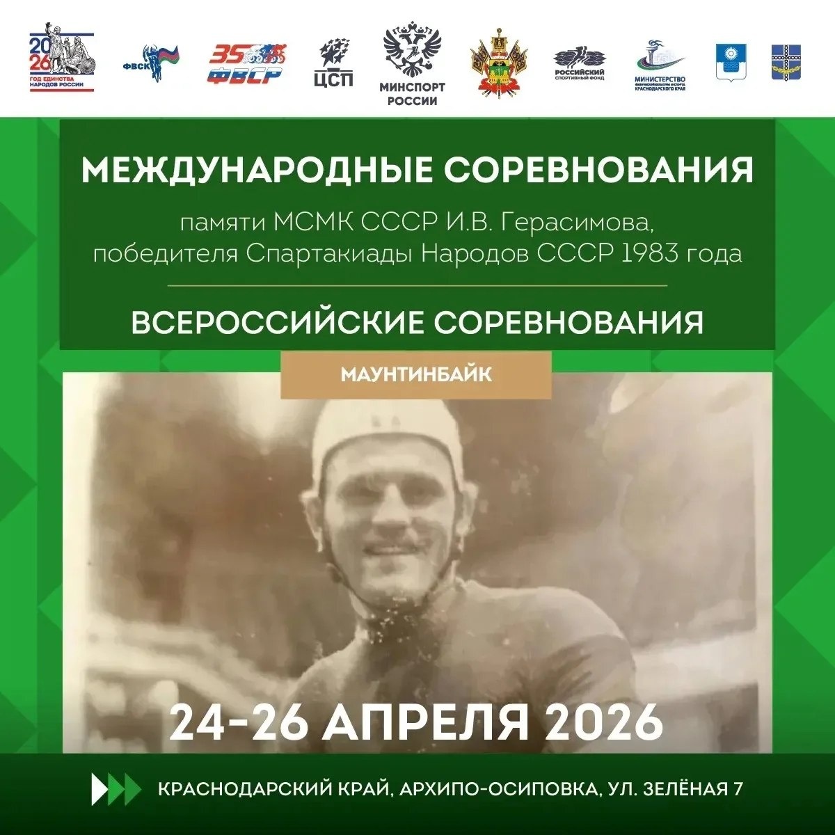 ! 🚵🏻♂️ В Архипо-Осиповке с 24 по 26 апреля пройдут Международные и Всероссийские соревнования памяти Игоря Герасимова. Соревнования пройдут в двух дисциплинах «короткий круг» и в олимпийском кросс-кантри, которые станут отбором на Спартакиаду Народов (сильнейших). ПРОГРАММА 24 апреля (пятница) кросс-кантри - короткий круг: 11:00 — девушки 13-14 лет; 11:40 — юноши 13-14 лет; 12:20 — девушки 15-16 лет; 13:00 — юноши 15-16 лет; 13:40 — женщины; 14:20 — мужчины; 15:10 — награждение. 25 апреля (суббота) кросс-кантри: 10:00 — девушки 13-14 лет; 10:50 — юноши 13-14 лет; 11:40 —девушки 15-16 лет; 12:50 — юноши 15-16 лет; 14:00 — юниорки 17-18 лет; 15:15 — Награждение. 26 апреля (воскресенье) кросс-кантри: 11:00 — женщины, юниоры 17-18 лет; 12:30 — мужчины; 14:00 — Награждение. Место проведения: Краснодарский край, Архипо-Осиповка, ул. Зеленая 7 Приходите поддержать спортсменов и почтить память Игоря Герасимова! Вход свободный! 🫵 Следи за новостями, чтобы не пропустить подробности!