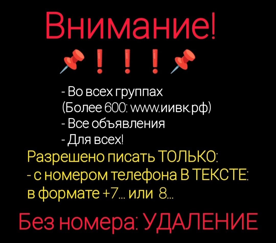 Лайфхак для рекламы: 🚫 ВНИМАНИЕ! ПРАВИЛА ГРУППЫ В группе разрешено размещать объявления ТОЛЬКО при соблюдении условий: 1️⃣ По теме группы — всё, что не по теме, удаляется без предупреждения 2️⃣ Обязательно с номером телефона в формате: +7... или 8... ❌ Без номера телефона объявления удаляются --- 📢 ПОЛНЫЙ СПИСОК ГРУПП (более 600) в мессенджерах Telegram, Макс, WhatsApp: 👉 www.иивк.рф --- 💰 ПОДДЕРЖАТЬ ПРОЕКТ В качестве донатов, чаевых, подарка, благодарность автору, в виде пополнения на любую сумму можно использовать: 1 Кошелёк 💳 ЮMoney: https://yoomoney.ru/fundraise/1H97CUOCUG2.260421 Номер кошелька ЮMoney: 41001313791158 2. Номер карты Яндекс Банка: 2204310362721063 --- 📣 ЗАКАЗАТЬ РЕКЛАМУ, РАССЫЛКУ И ПРОДВИЖЕНИЕ ваших объявлений: 📞 Телефон, WhatsApp, Макс: +7-918-608-69-39 ✈️ Telegram: @Andrey220280 Рассылка создана с помощью сервиса www.иивк.рф — Искусственный интеллект в кармане.