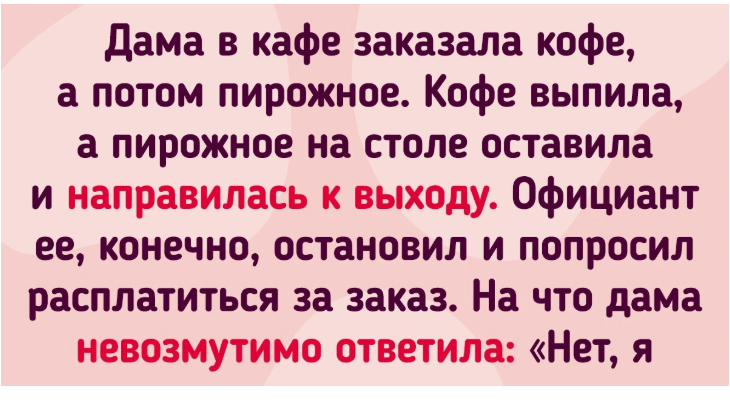 Дама в кафе заказала кофе, а потом пирожное. Кофе выпила, а пирожное на столе оставила и направилась к выходу. Официант ее, конечно, остановил и попросил расплатиться за заказ. На что дама невозмутимо ответила: «Нет. Я же не ела пирожное, а стоит оно дороже кофе. Вот и возьмите в качестве оплаты». © Furibonda