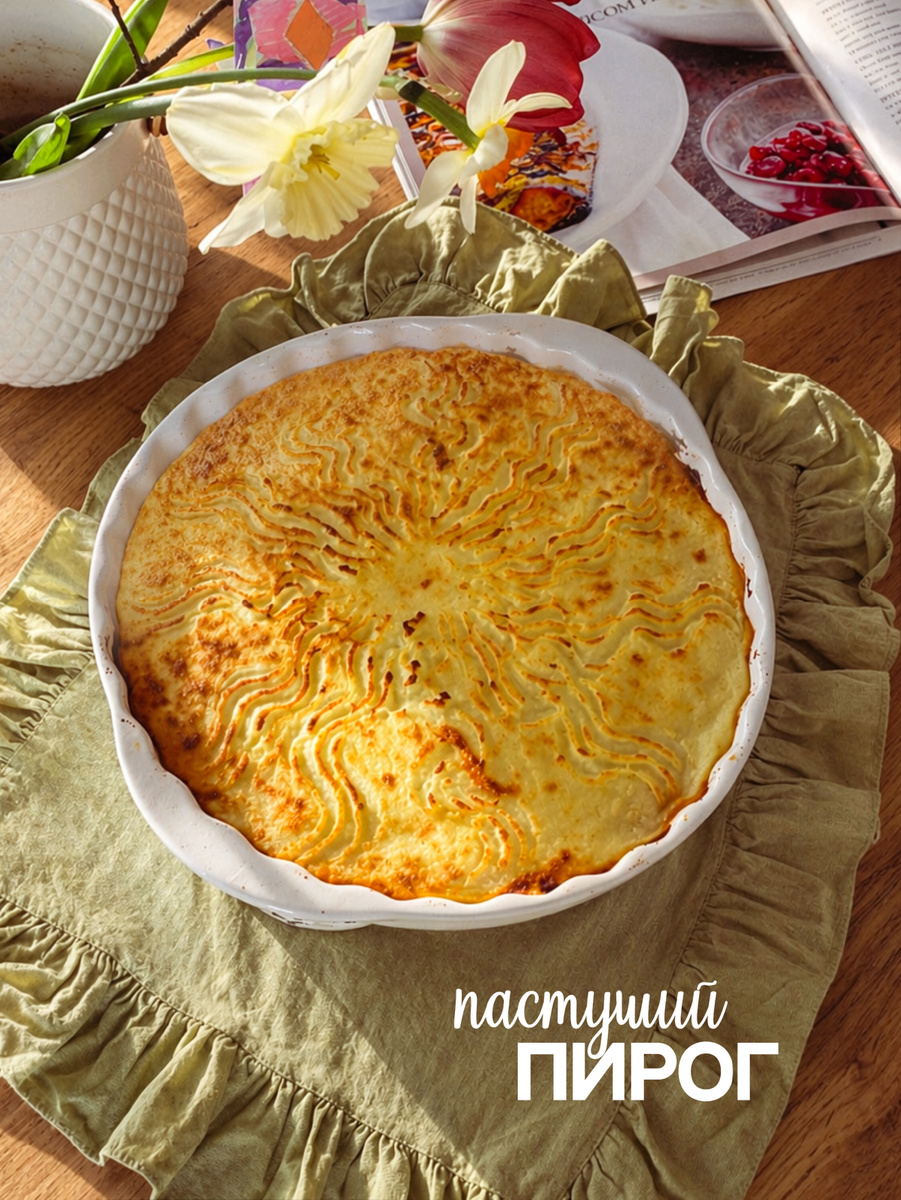 В форму выкладываем мясную основу, разравниваем, посыпаем тёртым сыром. Сверху распределяем пюре, разравниваем и делаем узор вилкой.