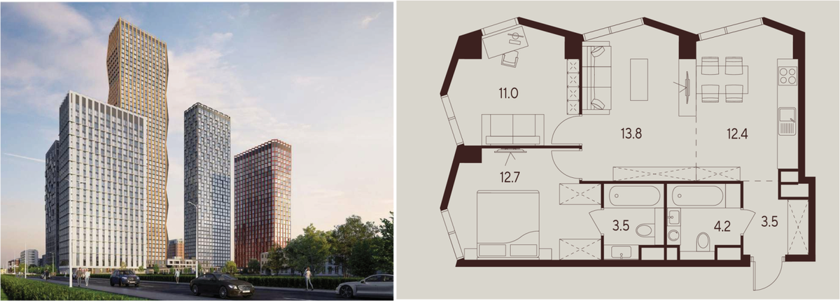 У проекта хороший потенциал роста: прогноз стоимости на ключах — 51–53 млн ₽. Хотя клиент сейчас и рассматривает этот сценарий, но в аренде ставка за такую квартиру будет в диапазоне 190 000–210 000 ₽ в месяц. То есть объект будет ликвидным активом с сильной экономикой.