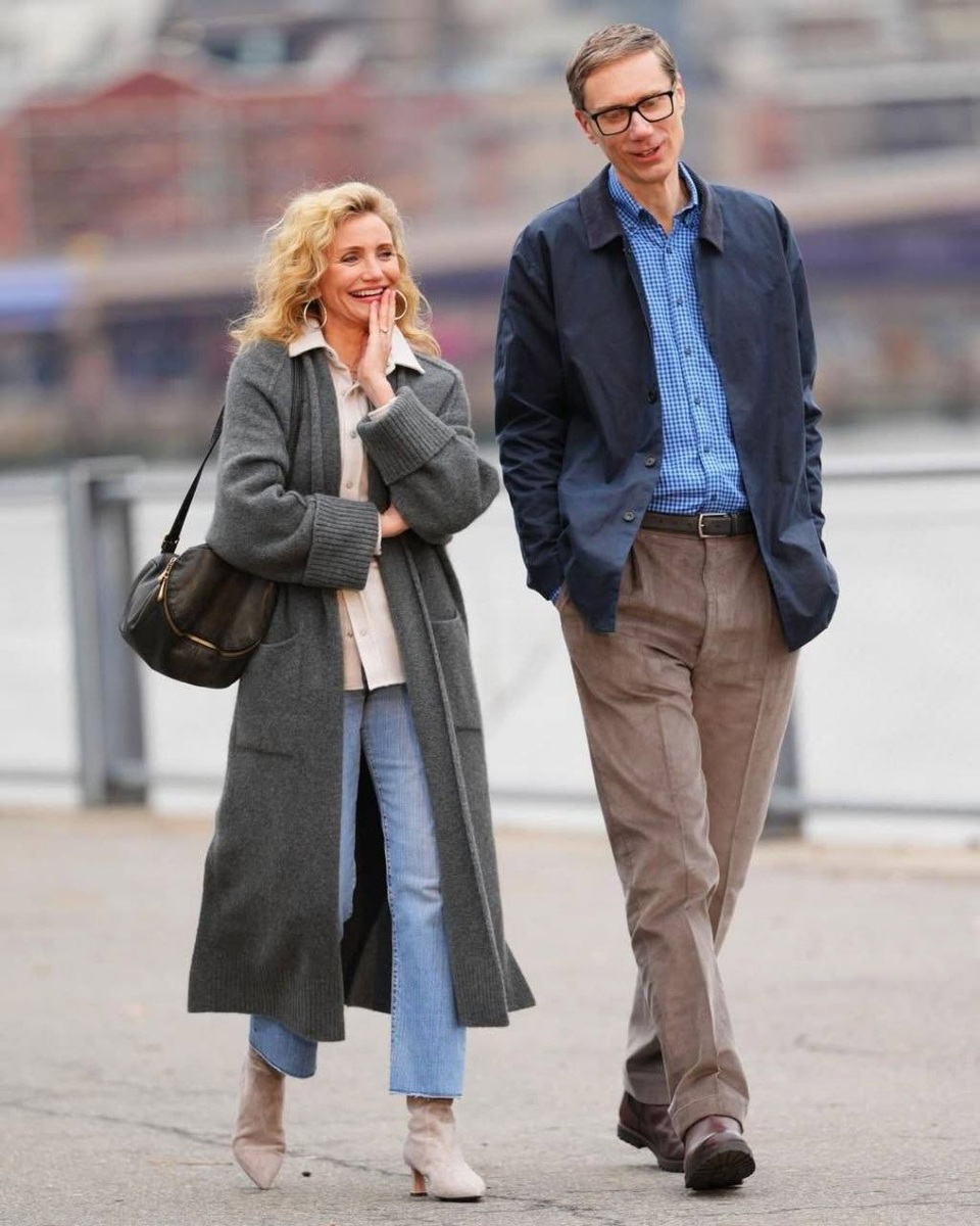 На днях я листала ленту и наткнулась на новые фотографии Кэмерон Диаз… и, честно говоря, немного зависла. Март, Нью-Йорк, набережная Гудзона. Кэмерон идет с кофе в руке, а рядом с ней какой-то очень высокий мужчина. На ней серое пальто-кардиган и самые обычные джинсы. Картинка — прямиком из какого-нибудь ромкома нулевых, в которых она была королевой. Но что-то не так. Приближаешь фото, и… видишь ее лицо. И тут меня, честно, накрыло. Это не глянцевая картинка, к которой мы привыкли. Это лицо 53-летней женщины. С морщинками-лучиками у глаз, с абсолютно естественными носогубными складками, с живой мимикой. Первая мысль, которая пронеслась в голове: «Ого, как она постарела». И стало как-то неуютно. Мы так привыкли видеть звезд вечно молодыми и отфильтрованными, что реальность порой удивляет. Оказалось, наша Кэм не просто так по Нью-Йорку гуляет. Это съемки новой романтической комедии от Amazon. И этот образ — не случайный выбор для прогулки, а костюм ее героини. А героиня у нее, судя п