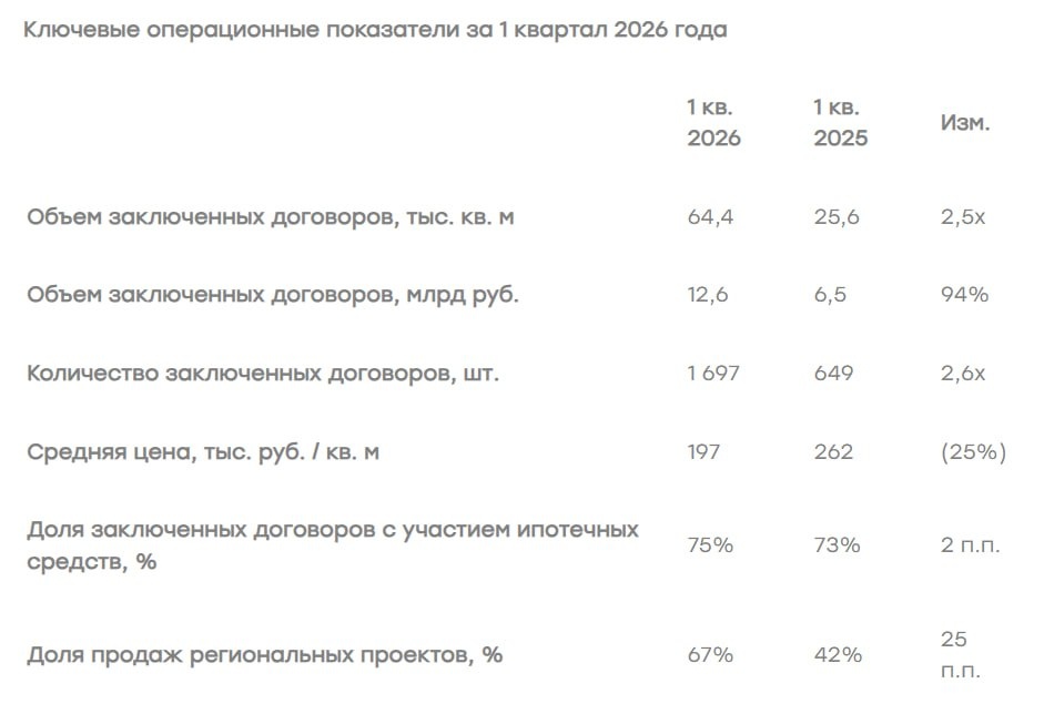 Несмотря на прохождение пика ключевой ставки, рынок жилья все продолжает медленно восстанавливаться, что подтверждает статистика – по данным ДОM.PФ за первый квартал этого года продажи в рублях выросли всего на 16% г\г. Но на этом фоне сильно выделяется операционный отчет GloraX за аналогичный период. если вкратце, то компания продолжает показывать кратный рост и опережать рынок. Разберем операционные показатели подробнее. 👉Ключевые операционные результаты ▪️Объем продаж: 12,6 млрд рублей (+94% г/г) ▪️Продано: 64,4 тыс. кв. м (рост в 2,5 раза) ▪️Количество сделок: 1 697 (+2,6х г/г) ▪️Средняя цена: 197 тыс. руб./кв. м (-25% г/г) При этом сами продажи метров по рынку, по оценкам ДОМ.PФ, выросли примерно на 12%, то есть GloraX продолжает кратно (х2,5) опережать рынок. Такие иксы в первую очередь обусловлены ставкой на регионы и запуском проектов там, где есть реальный платежеспособный спрос на жилье. 👉Что стоит за ростом Ключевой фактор, который действительно влияет – это смещение пр