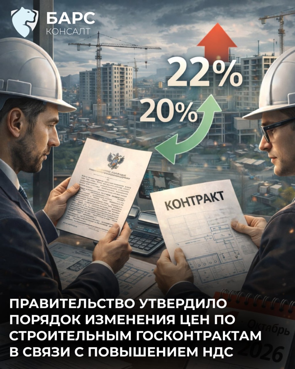 Если контракт был заключён до 1 января 2026 года и в нём не была учтена новая ставка НДС цену можно скорректировать. 👉Срок для изменений до 1 октября 2026 года, по соглашению сторон. Корректировка возможна строго в пределах увеличения ставки налога на те товары, работы и услуги, приёмка которых происходит после 1 января 2026 года. Кого касается: ✅Инженерные изыскания, проектирование, строительство, реконструкция, капитальный и текущий ремонт, снос объектов, благоустройство, строительный контроль и авторский надзор. Практически весь спектр строительной деятельности. Дополнительно стороны смогут изменять объёмы и виды работ или перечень строительных ресурсов без увеличения общей цены контракта. Для компаний, которые работают на федеральных госконтрактах — это возможность привести цены в соответствие с реальностью. Но только до 1 октября 2026 года. 📱 Барс-Консалт ⌨️ Связаться с нами: @bars_konsult 📱 Тел: +78432032418 📲 Мы в MAX 🎁 ПОЛУЧИТЬ БЕСПЛАТНЫЙ АУДИТ (кнопка "Прислать те