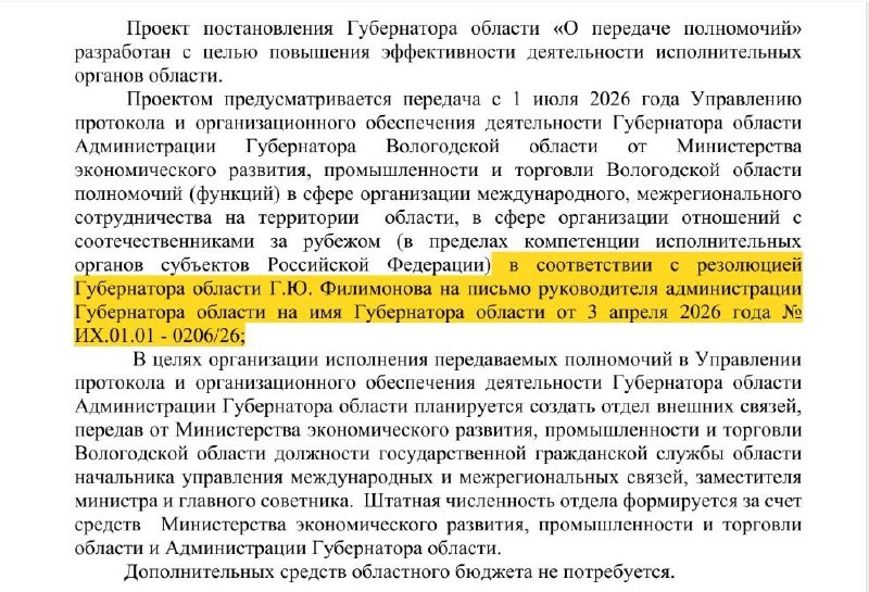 Соответствующий документ опубликовали на портале правовой информации региона. Согласно постановлению, с 1 июля этого года Минэкономразвития передаст Администрации губернатора часть функций, связанных с международным и межрегиональным сотрудничеством, а также работой с соотечественниками за рубежом. Новые задачи перейдут в Управление протокола и организационного обеспечения деятельности губернатора. Для реализации переданных полномочий планируют создать отдел внешних связей. В него перейдут отдельные должности из Министерства. Telegram | ВКонтакте | Rutube | Одноклассники | Дзен | MAX |35MEDIA в MAX