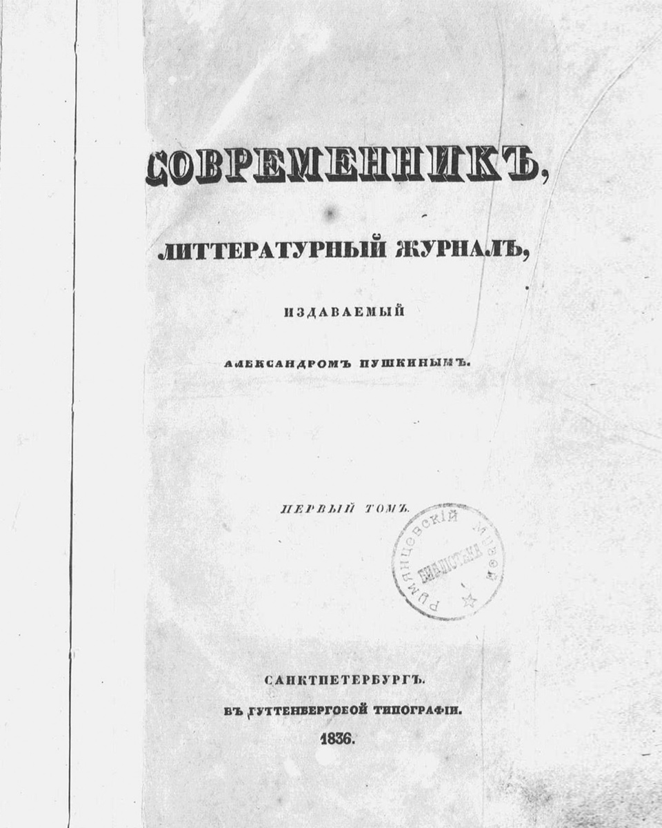190 лет назад, 23 апреля 1836 года, в Санкт-Петербурге вышел первый номер журнала Александра Сергеевича Пушкина «Современник