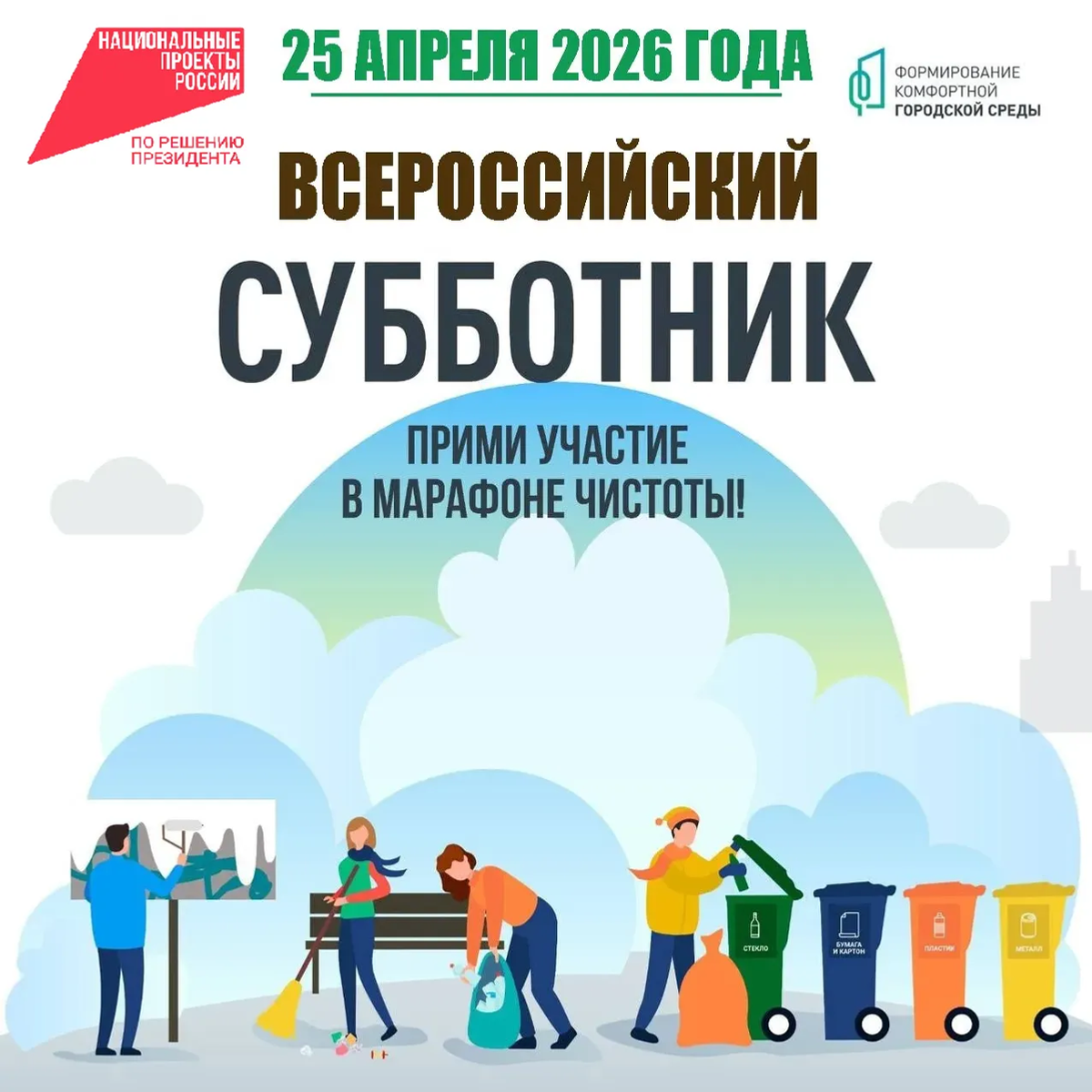 Жителей республики ждут на масштабной уборке и благоустройстве территорий, приуроченной к Всероссийскому субботнику. 25 апреля Башкирия присоединится к Всероссийскому субботнику. В этот день участники приведут в порядок придомовые и общественные территории, высадят растения, обновят малые архитектурные формы и покрасят элементы благоустройства. Мероприятие также включает мастер-классы, спортивные состязания и лекции. Желающие смогут принять участие в онлайн-голосовании за объекты благоустройства на 2027 год. Инициатива поддержана Главой Башкирии Радием Хабировым. «25 апреля просьба организовать очередной масштабный субботник, информировать население. Пожалуйста, коллеги, выходим, чистим убираем, чтобы все чисто у нас было», — дал указания Радий Хабиров.