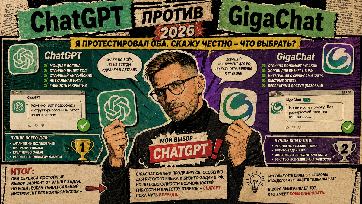 ChatGPT — для кода и сложной аналитики. GigaChat — для русскоязычного контента и клиентских коммуникаций.