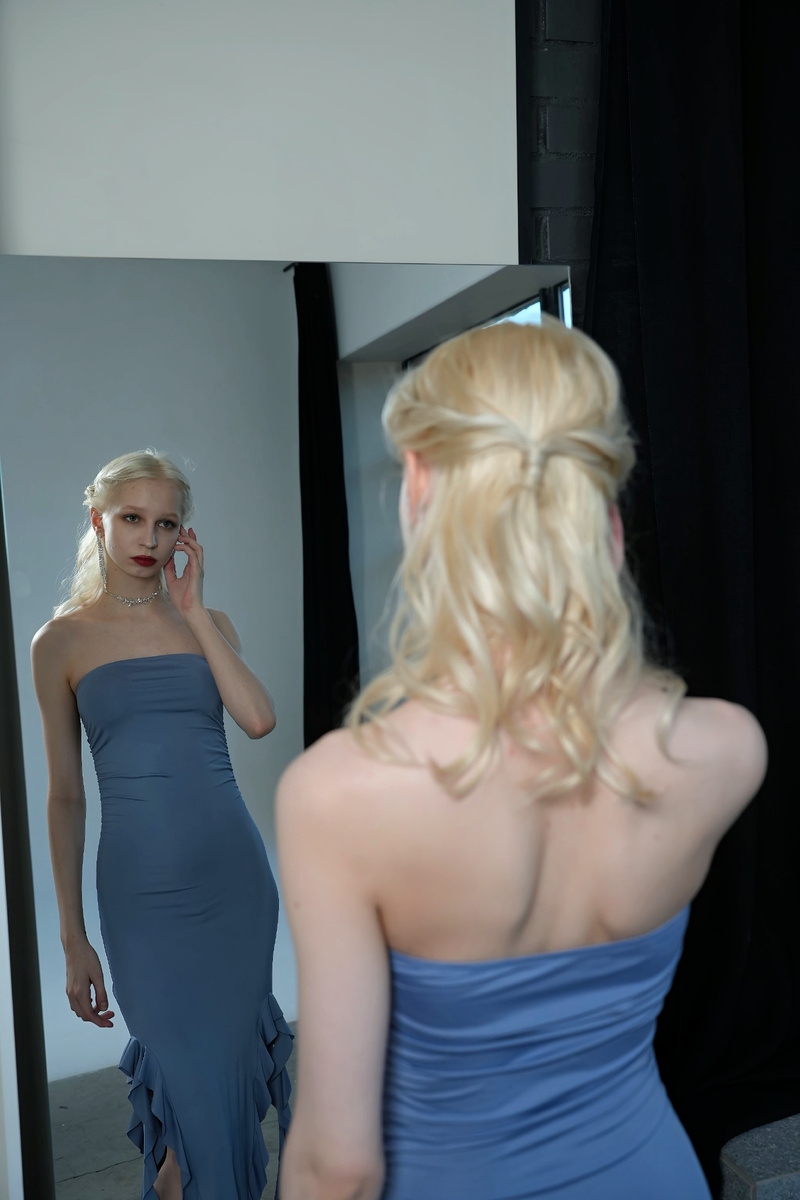 В этой фотосессии Лиза С. предстает в образе, где минимализм становится главным инструментом раскрытия внешности. Съёмка выполнена в формате модельных тестов — без лишнего декора, с акцентом на естественную пластику, черты лица и умение работать с камерой. С первого кадра внимание притягивает внешность модели. У Лизы светлая фарфоровая кожа с мягким, ровным тоном, который особенно красиво раскрывается в нейтральном студийном освещении. Черты лица тонкие, аккуратные: высокий лоб, изящная линия носа, четко очерченные губы. Взгляд спокойный, немного отстранённый, с легкой долей холодной уверенности — именно такой типаж часто востребован в fashion-индустрии. Макияж выдержан в классической, но выразительной гамме. Основной акцент сделан на губы — насыщенный красный оттенок добавляет образу глубины и контраста. Глаза подчеркнуты минимально: легкая тушь и едва заметная растушевка создают эффект естественной выразительности. Кожа выглядит «живой», без перегруженного матирования — это важный эл