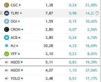 ΠΊΠΎΡΠΈΡΠΎΠ²ΠΊΠΈ Curaleaf Π²Π·Π»Π΅ΡΠ΅Π»ΠΈ Π½Π° 26%, Trulieve Cannabis β ΠΏΠΎΡΡΠΈ Π½Π° 17%, Green Thumb Industries ΠΏΡΠΈΠ±Π°Π²ΠΈΠ»ΠΈ 10%. ΠΡΡΠΏΠ½Π΅ΠΉΡΠΈΠΉ Π±ΠΈΡΠΆΠ΅Π²ΠΎΠΉ ΡΠΎΠ½Π΄, ΠΎΡΡΠ»Π΅ΠΆΠΈΠ²Π°ΡΡΠΈΠΉ ΠΈΠ½Π΄ΡΡΡΡΠΈΡ, AdvisorShares Pure US Cannabis ETF Π²ΡΡΠΎΡ Π½Π° 22%. Π Π΅ΡΡ Π½Π΅ ΠΈΠ΄Π΅Ρ ΠΎ Π»Π΅Π³Π°Π»ΠΈΠ·Π°ΡΠΈΠΈ, Π° ΠΎ ΡΠ½ΠΈΠΆΠ΅Π½ΠΈΠΈ Π±Π°ΡΡΠ΅ΡΠΎΠ² Π΄Π»Ρ ΠΏΡΠΎΠ²Π΅Π΄Π΅Π½ΠΈΡ ΠΈΡΡΠ»Π΅Π΄ΠΎΠ²Π°Π½ΠΈΠΉ ΠΏΠΎΡΠ΅Π½ΡΠΈΠ°Π»ΡΠ½ΠΎΠ³ΠΎ ΠΈΡΠΏΠΎΠ»ΡΠ·ΠΎΠ²Π°Π½ΠΈΡ, ΠΏΠΈΡΠ΅Ρ