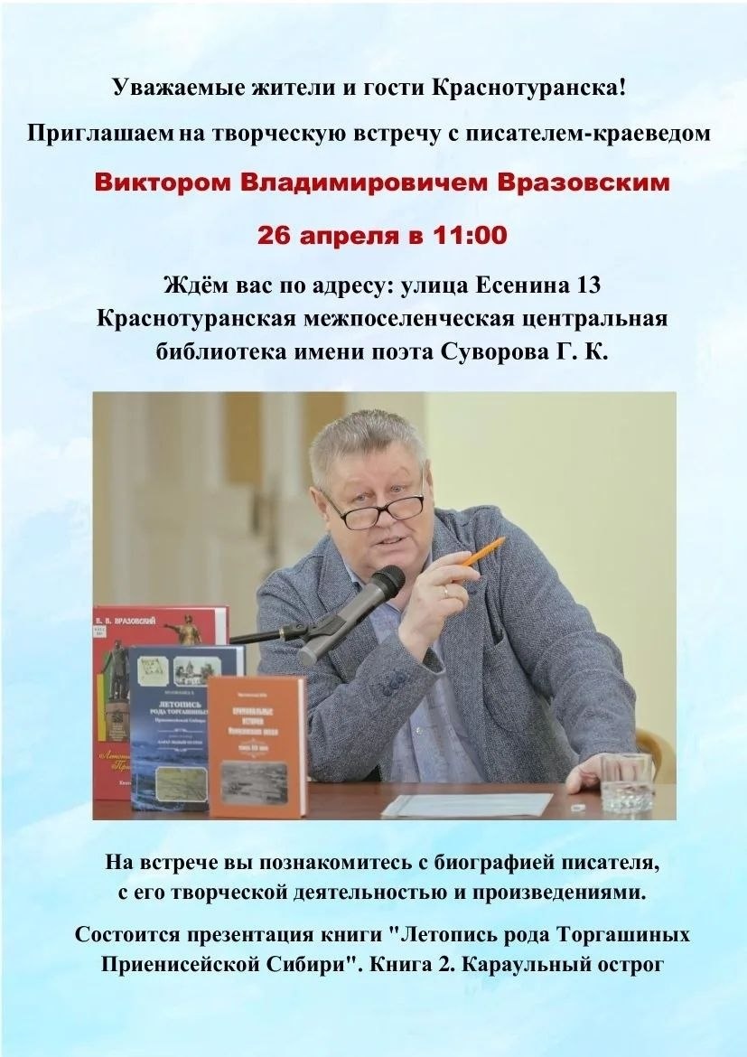 ! Приглашаем вас на встречу с Виктором Вразовским знатоком истории нашего края и рода Торгашиных. Для автора это личная встреча: его мама — уроженка села Сыда. Прикоснитесь к истории основания СЫДЫ и УСТЬ-СЫДЫ и найдите свои корни. Ждем каждого из вас!