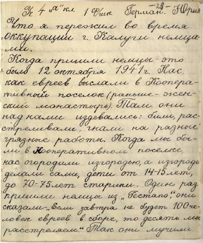 » Так написал в своём сочинении ученик 4 «А» класса средней школы № 1 Юрий Герман. Он сделал это через год после освобождения Калуги от фашистов. Мальчик рассказывает, что ему пришлось пережить во время оккупации. 12 октября 1941 года в Калугу вошли немцы. Всех евреев согнали в кооперативный посёлок, где раньше был женский монастырь. «Когда мы были в кооперативном поселке, нас огородили изгородью, а изгородь делали сами дети от 14-15 лет до 70-75 лет старики», — пишет Юра. Это место называли «гетто». Часто туда приходили немцы и забирали вещи — одеяла, подушки, простыни для фронта. «Что им нравилось, то они и уносили», — вспоминает мальчик. Когда очередь дошла до квартиры Юры, немцы забрали лампу и валенки у дедушки. Они угрожали, что если он не отдаст вещи, то всех расстреляют. 🙏🏼 Но 19 декабря послышались первые выстрелы, а уже 21 декабря немцы подожгли посёлок, и людям приходилось прятаться в бомбоубежищах и у знакомых. В ночь на 30 декабря шёл ожесточённый бой. «На утро в