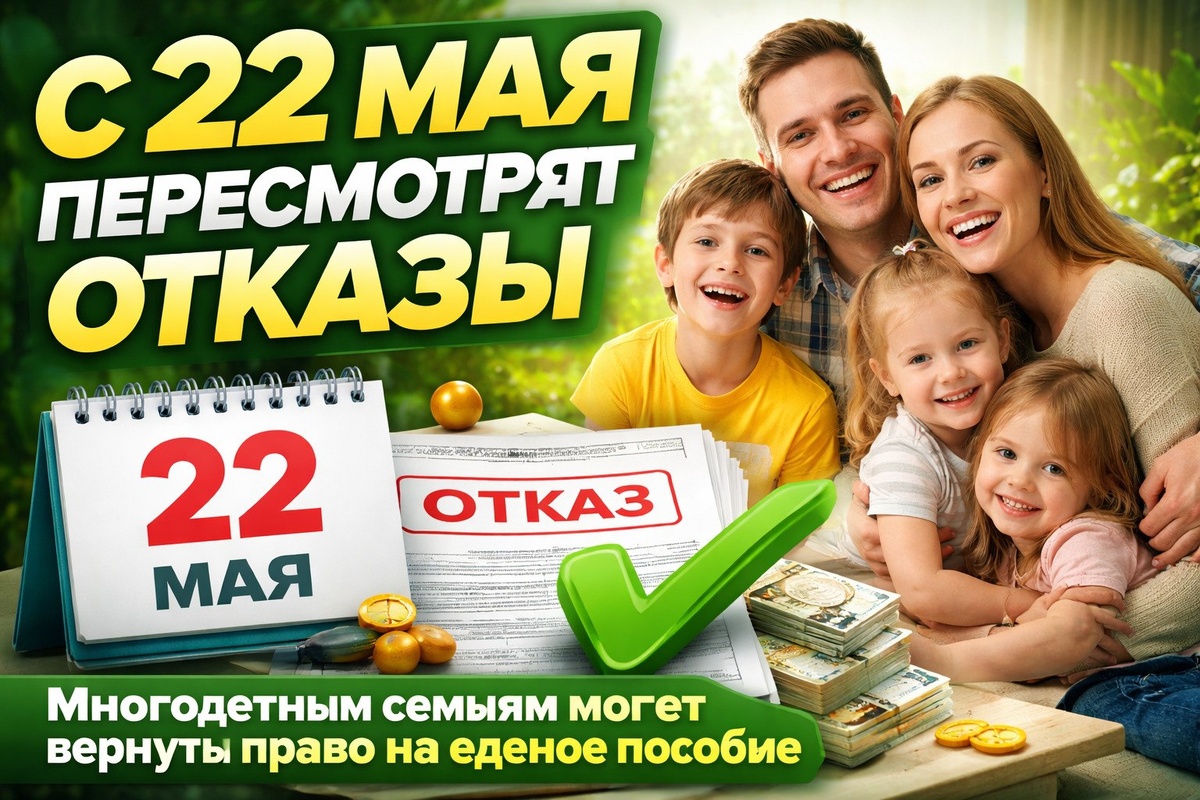 С 22 мая Социальный фонд начнёт автоматически пересматривать отказы по единому пособию для многодетных семей. Если раньше вам отказали из-за того, что доход слегка превысил прожиточный минимум — теперь это не повод оставить семью без выплат. Новое правило: если среднедушевой доход многодетной семьи выше регионального ПМ, но не более чем на 10% — пособие сохранят. Размер фиксированный — 50% от прожиточного минимума на ребёнка. В среднем по стране это около 8 000–9 000 рублей в месяц на каждого ребёнка. Для семьи с тремя детьми — от 27 000 рублей в месяц. Главное: перерасчёт пройдёт проактивно — идти никуда не надо, Соцфонд пересмотрит отказы с января 2026 года автоматически. Правда, только если отказ был именно из-за дохода, а не из-за имущества — две машины в семье льгота не перекроет.