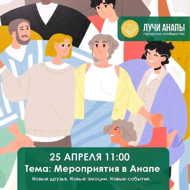 ! За полтора часа в уютной атмосфере: ✨ Узнаешь о ближайших событиях; ✨ Найдёшь близких по духу людей, новых друзей и единомышленников ✨ Сможешь стать частью инициативной группы и создавать свои мероприятия; ✨ От "Лучи Анапы" будут вкусные комплименты. Все встречи и активности бесплатны, если захотим куда то поехать, то по себестоимости! Без ограничений по возрасту, каждый найдёт формат по душе. Бери друзей, присоединяйтесь к сообществу ➡️ https://t.me/baza_young 🗓25 апреля, с 11:00 до 12:30 📍Кофейное бистро «Салют. Дваит» ул. Калинина, 30, корп. 3 📲 +79180907301 Вход свободный при регистрации по ссылке:https://forms.yandex.ru/u/69e902a9902902b554f54372 Не упусти шанс — Анапа ждёт твоих идей! 🚀 Ваш паблик 🔆 Жить на море 🛜 Жить на Море в МАКС