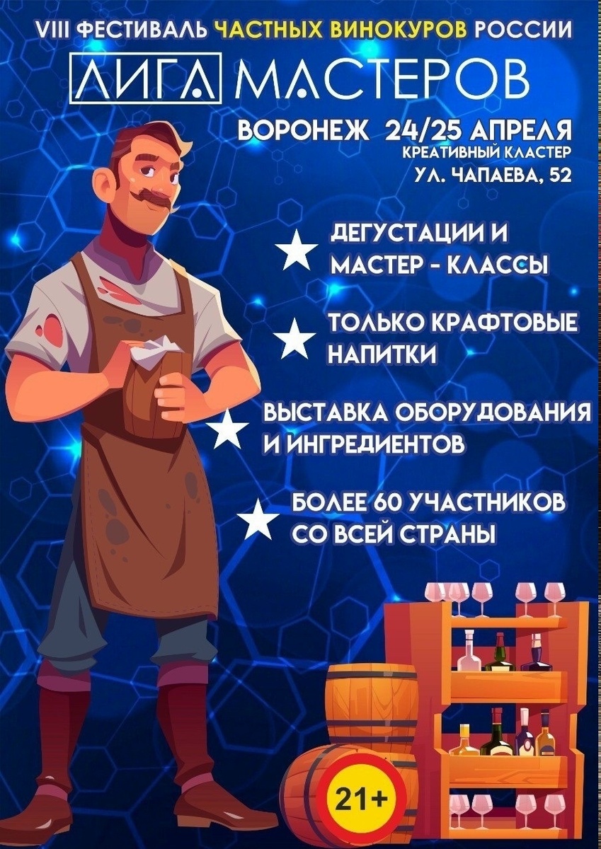 Лига Мастеров. Фестиваль Винокуров. День гостей формат: #фестиваль@vrncity2day #25апреля2026@vrncity2day Время: 11:00 Место: Креативный кластер Станция, (4 этаж) Адрес: г. Воронеж, ул. Чапаева, 52 Подробнее: 11:00 - 12:00 — Начало работы Лиги Мастеров. Регистрация зрителей по браслетам. 12:00 — Официальное открытие Лиги Мастеров. Представление мастеров и жюри фестиваля. Первые награждения мастеров. 12:00 - 14:30 — Открытые дегустации. Конкурсная программа для зрителей. Награждение мастеров по третьему блоку номинаций. 15:00 - 16:00 — Технический перерыв. Уборка территории. 16:00 - 18:00 — Большая конкурсная программа для зрителей, шоу-программа, мастер-классы от партнеров и спонсоров Лиги Мастеров. 18:00 - 19:00 — Награждение по спонсорским номинациям! Награждение по последнему блоку номинаций. Выступление артистов, шоу-программа. Вручение Кубка – Самый Красивый Стенд. Вручение Приза Зрительских Симпатий. 20:00 — Окончание работы фестиваля Лига Мастеров 2026. Возрастное ограничение: 1