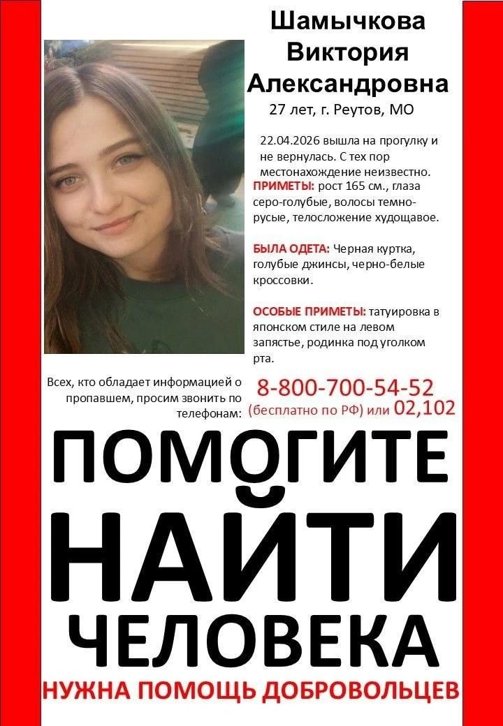 ‼️ Шамычкова Виктория Александровна 27 лет, г. Реутов, МО 22.04.2026 вышла на прогулку и не вернулась. С тех пор местонахождение неизвестно. ПРИМЕТЫ: рост 165 см, глаза серо-голубые, волосы темно-русые, телосложение худощавое. БЫЛА ОДЕТА: Черная куртка, голубые джинсы, черно-белые кроссовки. ОСОБЫЕ ПРИМЕТЫ: татуировка в японском стиле на левом запястье, родинка под уголком рта. ‼️ Максимальный репост «Мой Реутов» в MAX: https://max.ru/reutov_today