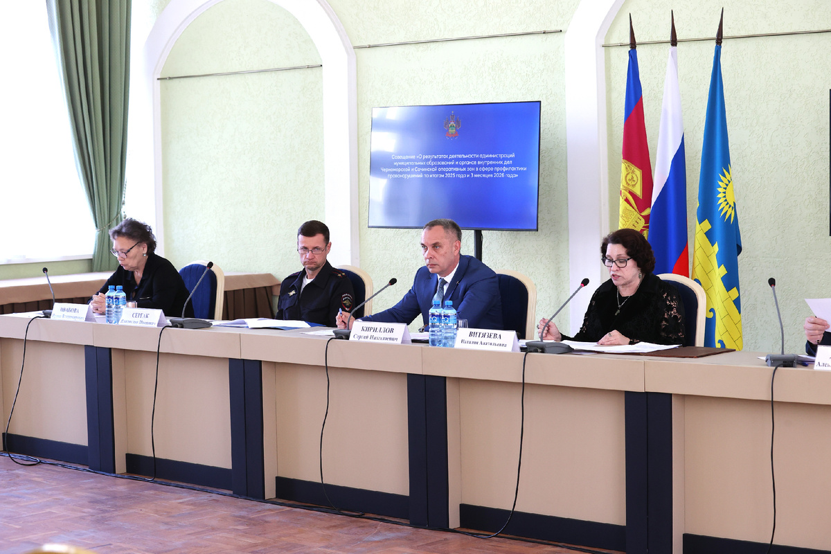Сегодня в Гортеатре состоялось совещание по результатам работы администраций муниципалитетов и органов внутренних дел Черноморской и Сочинской оперативных зон в сфере профилактики правонарушений за 2025 и 3 месяца 2026 года. Его провел замначальника управления региональной безопасности администрации Краснодарского края Сергей Кириллов. В работе приняли участие представители муниципальных образований городов Анапа, Новороссийск, Геленджик, Туапсе и Сочи, а также полиции, министерств здравоохранения, труда и социального развития Кубани, начальники филиалов УИИ ГУФСИН по Краснодарскому краю, а также финалист кадрового конкурса «Герои Кубани», кавалер ордена Мужества и ордена «За заслуги перед Отечеством» Евгений Двоеглазов. Начальник управления по взаимодействию с правоохранительными органами мэрии Анапы Андрей Пападопулос рассказал, что на территории города-курорта взаимодействие субъектов профилактики и территориальных комиссий сельских округов обеспечивает координационная комиссия по п