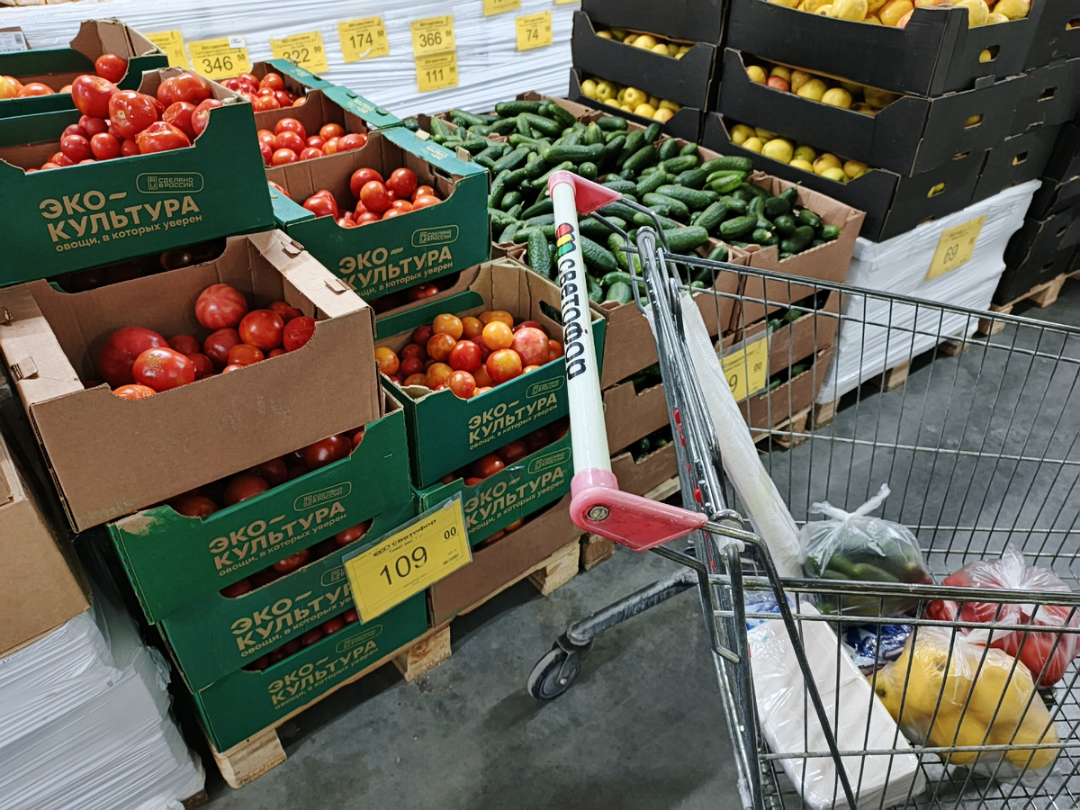 С приближением выходных ассортимент в магазине "Светофор" постоянно обновляется, и эта неделя не стала исключением. В большом количестве завезли недорогую свинину, помидоры, огурцы, яблоки и другие продукты. Их, вероятно, хватит на 2–3 дня активных продаж. Особенно важно, что цены действительно очень низкие, и иногда разница может достигать 50% при сравнении с конкурентами, что особенно актуально для тех, кто хочет сэкономить. И в этом обзоре, делюсь с вами увиденным в "Светофоре" города Крымск. Начну, конечно, с помидоров, ведь цена в 109 рублей за 1 кг просто поражает по сравнению с конкурентами, которые продают их за 250 рублей. Все помидоры разного размера, встречаются даже похожие на черри, и их очень много, но цена остается одинаковой. В итоге я набрала целый пакет маленьких плодов. Небольшие свежие огурчики с пупырышками по 10-13 см. Цена 99 рублей за 1 кг. На салат и для украшения разных блюд они прекрасно подходят, а главное ароматные и хрустящие. Учитывая, что скоро майские