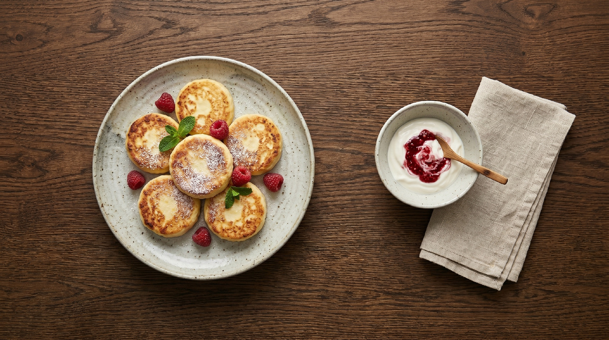 Подавай горячими со сметаной, вареньем или сгущёнкой. Я люблю с вишнёвым вареньем: кислинка балансирует сладость теста. Если подаёшь не сразу, накрой тарелку крышкой или фольгой — сырники быстро остывают и теряют ту самую нежность.