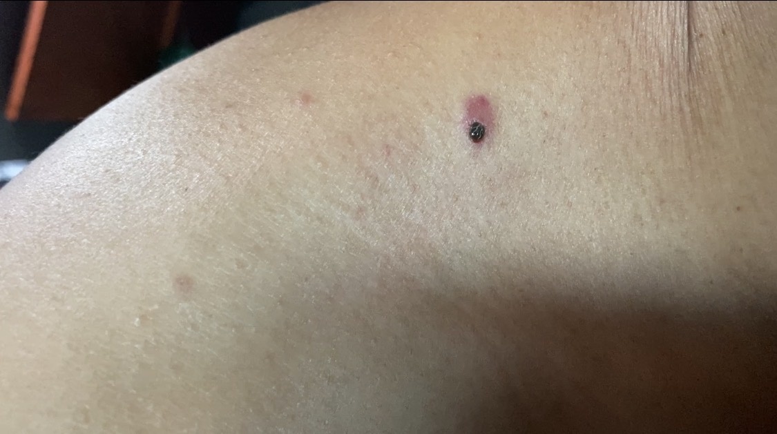 Смотрим вместе — и всё становится ясно. Клещ. Чёрный, уже надутый, довольный жизнью. Видимо, сидел давно и спокойно пил соки моего Саши без разрешения.