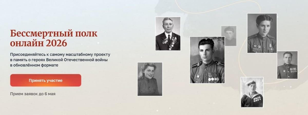 » Подать заявку можно до 6 мая на сайте акции https://2026.polkrf.ru/, в приложениях «ВКонтакте», «Одноклассники» или MAКС. В личном кабинете нужно разместить фотографию и информацию об участнике Великой Отечественной войны или труженике тыла. Трансляция пройдет 9 мая в 12.00 по местному времени.