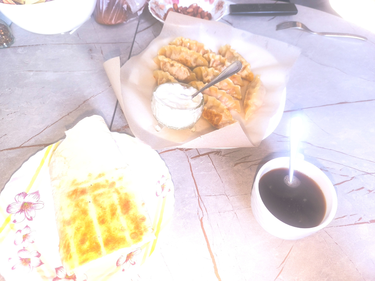 Домашняя тортилья из тостера (начинка индейка, лист салата, сыр , огурчик, помидорка) ,дамплинги жареные +соус греческий йогурт с чесноком. Кофе .