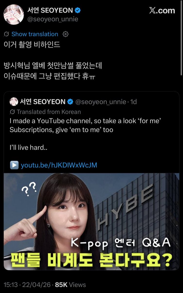 Соён в Х: Это был бэкстейдж со съёмок. Я рассказала историю о своей первой встрече с Бан Шихёком в лифте, но из-за нынешнего скандала просто вырезала этот момент из видео. Эх. @skandalbomb