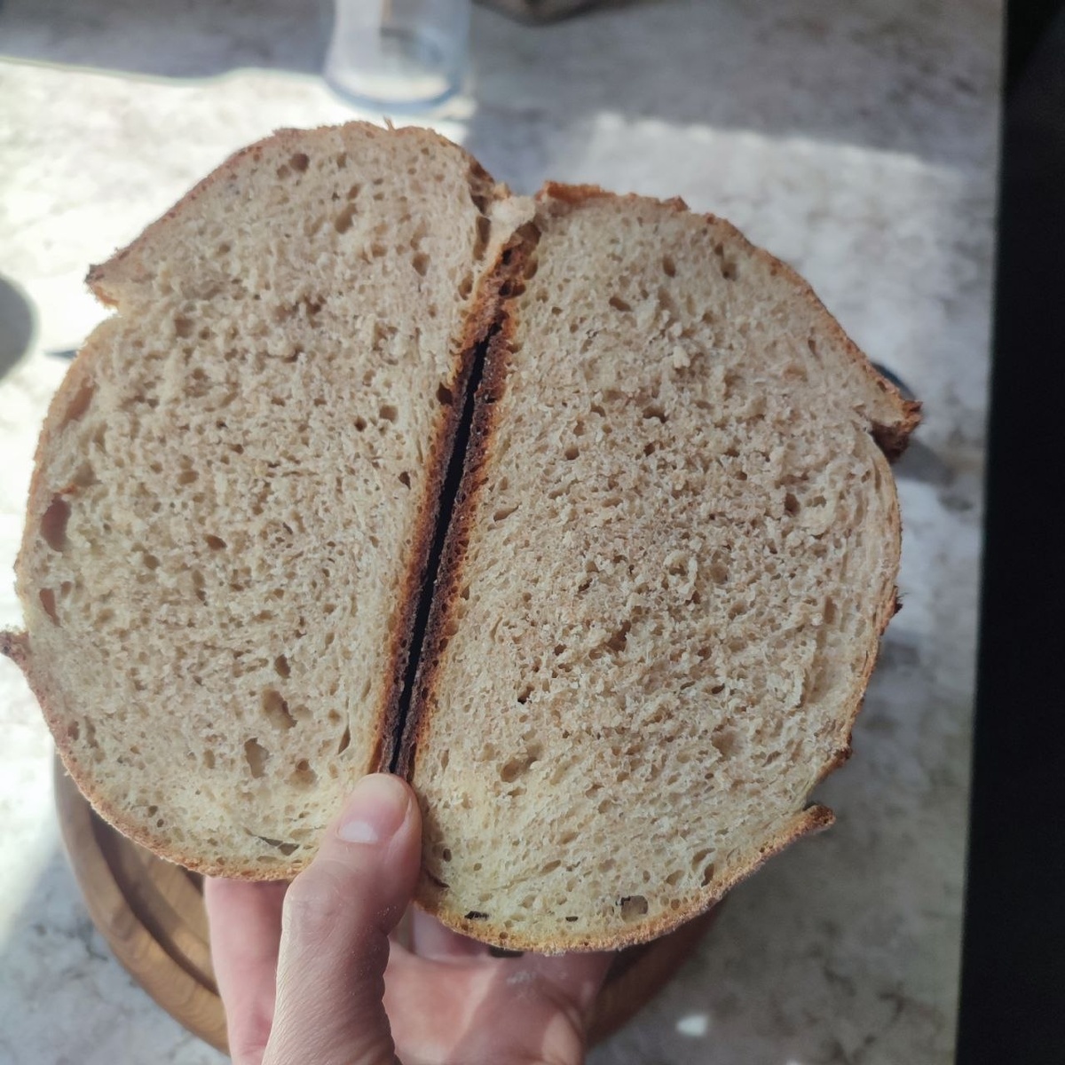 Разрезала один ещё теплым, чтобы попробовать. Мякиш конечно примялся. Вкус неожиданный - смесь сдобной булочки и цельнозернового хлеба. Действительно напоминает батон, но с добавкой цз! И чуть-чуть в самом далёком послевкусии минимальный намек на кислинку. Ничего так:) прикольно! Не знаю понравится ли адресату, но вроде неплохо