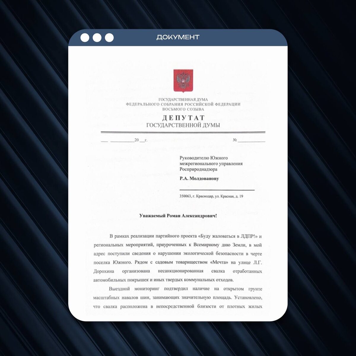 Мусорная реформа в текущем виде не справляется с поставленными задачами. По данным Росприроднадзора, только в 2025 году в России выявлено более 9,5 тысячи новых стихийных свалок. Несмотря на работу по их ликвидации, проблема сохраняется — на месте одних появляются новые. Очевидно, что действующая система обращения с отходами требует серьезного пересмотра. Передача ключевых функций частным операторам не дала ожидаемого результата: создать с нуля полноценную цепочку — от сбора и сортировки до переработки и повторного использования — оказалось крайне сложно. Если коммерческие структуры не справляются с обязанностями и люди продолжают сталкиваться с проблемами, государство должно взять эту сферу под свой контроль. В рамках реализации партийного проекта «Буду жаловаться в ЛДПР!» и мероприятий, приуроченных ко Всемирному дню Земли, в Краснодарское региональное отделение поступило обращение о нарушении экологической безопасности в поселке Южном. Установлено, что вблизи садового товарищества