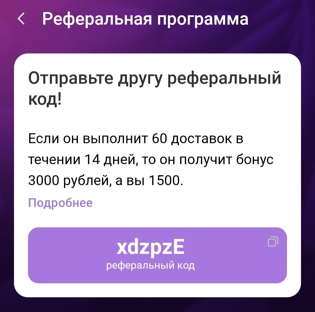В приложении действует реферальная программа: если указать код при регистрации, можно получить дополнительный бонус на старте. При выполнении 60