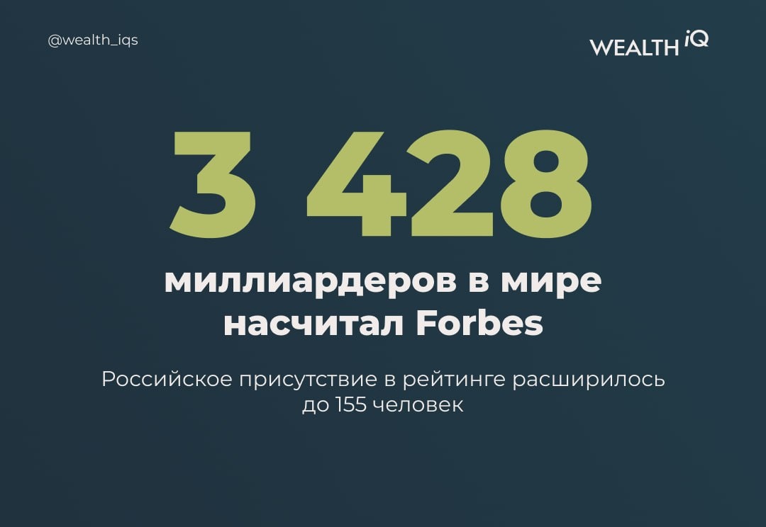 Именно столько долларовых миллиардеров насчитал Forbes в своем 40-м ежегодном рейтинге. За год всемирный клуб ультрасостоятельных людей вырос на 400 участников. Совокупный капитал списка также обновил максимумы, прибавив 4 трлн долларов (теперь это 20,1 трлн). Российское присутствие в рейтинге расширилось со 146 до 155 человек. Возглавил отечественный список Алексей Мордашов (Nordgold). На его счету абсолютный рекорд: впервые в истории рейтинга состояние участника из России превысило 30 млрд долларов. Читать на Forbes полностью. #цифра_дня 🏦 Wealth iQ