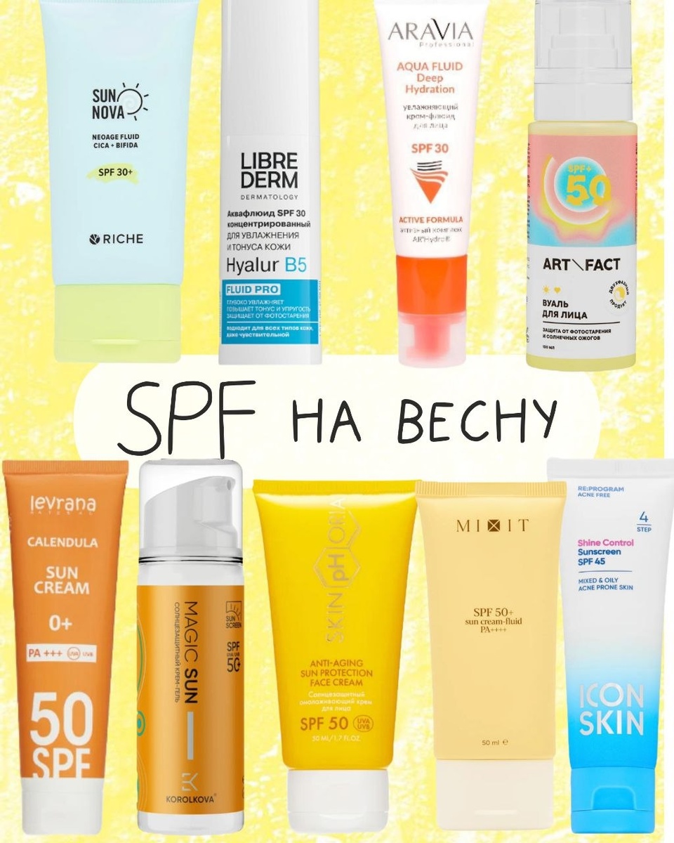 Кожа получает дозу фотостарения даже когда вы просто вышли за кофе, а облачка совсем не спасают. Например в Москве, не смотря на дожди и даже снег, УФ индекс держится на отметке 2 Так что SPF весной хорошая инвестиция в гладкую кожу без сюрпризов к 35+. После зимы кожа особенно чувствительная, поэтому к SPF требования двойные: защита + комфорт без сухости и жирной плёнки Разобрала 6 средств и выбрала, кому что подойдёт: 1. Riche SPF30 с центеллой и постбиотиком Плюсы: лёгкая эмульсия, центелла + бисаболол успокаивают, постбиотик поддерживает микробиом. И в составе нет спирта Кому: сухая и чувствительная, реактивная кожа без акне. Напоминаю, что SPF30 для пасмурных дней и коротких выходов, если вы не применяете ретинол и кислоты 2. Art&Fact вуаль SPF50 Плюсы: современные фильтры, очень лёгкая текстура, которая не перегружает лицо Кому: нормальная, жирная, комбинированная кожа 3. Mixit Back to Sun SPF50 Плюсы: хорошие фильтры, внутри алоэ, пантенол, аллантоин. Тоже нет спирта Кому: с