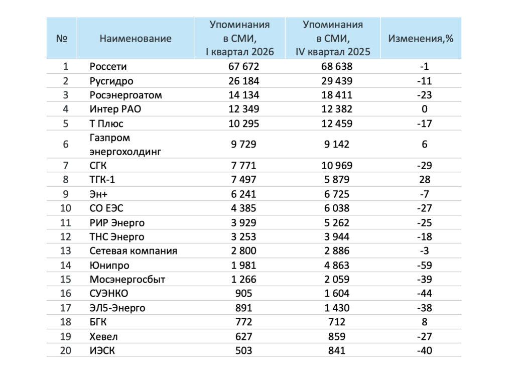 В 1 квартале 2026 года тройка лидеров медиарейтинга российских энергетических компаний осталась неизменной по сравнению с 4 кварталом 2025 года. Первое место сохранило за собой ПАО «Россети», количество упоминаний этой компании достигло 67 672, сократившись на 1% относительно предыдущего периода. Второе место занимает ПАО «РусГидро», его медиаполе насчитывает 26 184 публикации, что на 11% меньше по сравнению с 4 кварталом 2025 года. Замыкает тройку АО «Концерн Росэнергоатом», количество упоминаний которого сократилось на 23% и составило 14 134.