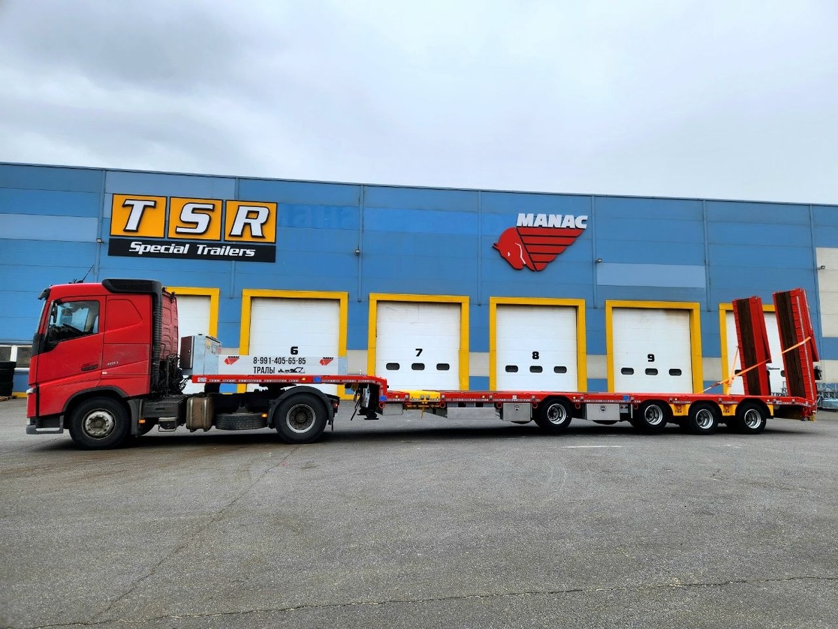 Полуприцеп оснащён гидравлическими аппарелями двойного сложения для минимального угла заезда 8°. Управление аппарелями возможно как с ящика управления так и с пульта ДУ. Также с помощью пульта ДУ можно не выходя из кабины тягача: ✅ поднять/опустить оси полуприцепа (в данной комплектации три подъёмных оси — первая, вторая и четвёртая); ✅ включить/выключить стробоскопы на выдвижных знаках Негабарит; ✅ увеличить нагрузку на первую (вынесенную) ось полуприцепа для разгрузки ведущей оси тягача. Клиент будет использовать полуприцеп для перевозки собственной строительной техники и оборудования при строительстве автомобильных дорог и магистралей, жилых и нежилых зданий. Мы в MAX: https://max.ru/id3123448077_biz