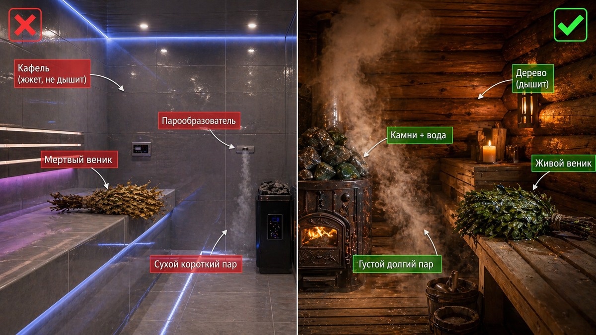 Если в парилке потолок под 3 метра, керамическая плитка на стенах и светодиодная лента — это не русская баня. Это «хамам по-русски» или просто горячая комната с красивой картинкой.