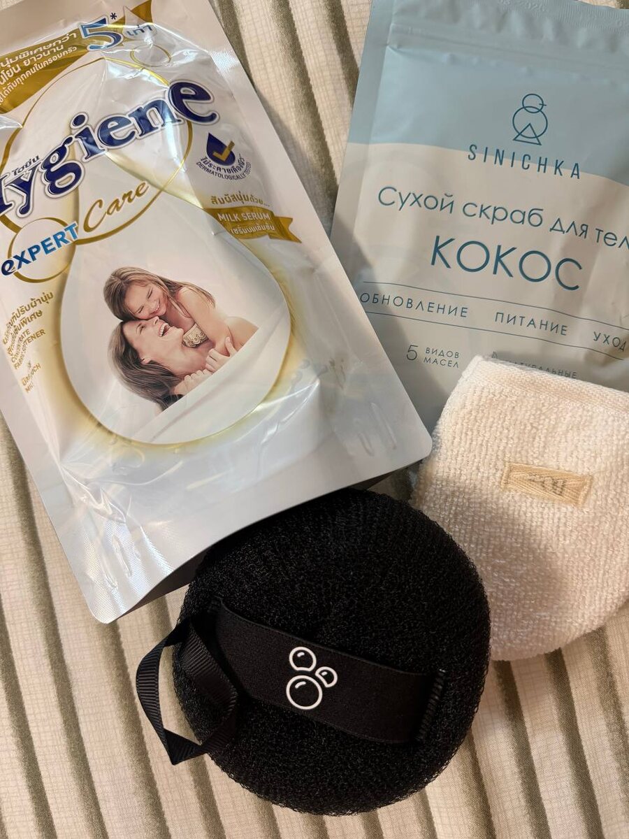 Называется отдушка «нежность молока» 🤍 Безумно понравился скраб для тела сухой сахарный с кокосом Синичка, девочки, аромат просто божественный 🥥🫠 Ну и какая-то забавная круглая мочалка для душа)) Варежка для умывания с эффектом пилинга, кто-нибудь пробовал такие? Маска и зубная паста Marvis уже, так сказать, база 😁