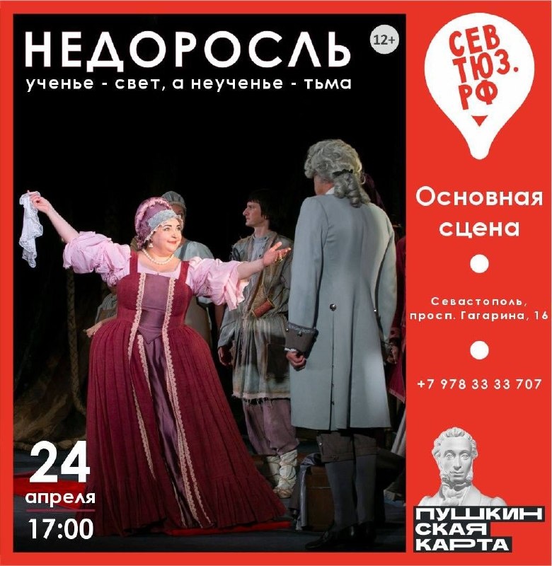 » Иногда может показаться, что произведения, которые были написаны больше двух веков назад, утратили свою актуальность. Но СевТЮЗ доказывает обратное. Классика – это про нас с вами. Приходите на спектакль по бессмертной комедии Дениса Фонвизина «Недоросль» и убедитесь в этом. 👉 Когда? 24 апреля в 17:00 👉 Где? Проспект Гагарина, 16 👉 Принимаем оплату Пушкинской картой. 👉 Касса: +7 (978) 33-33-707 Онлайн-касса 24/7 ✨Давай сходим, Севастополь | Читайте и смотрите нас в МАХ