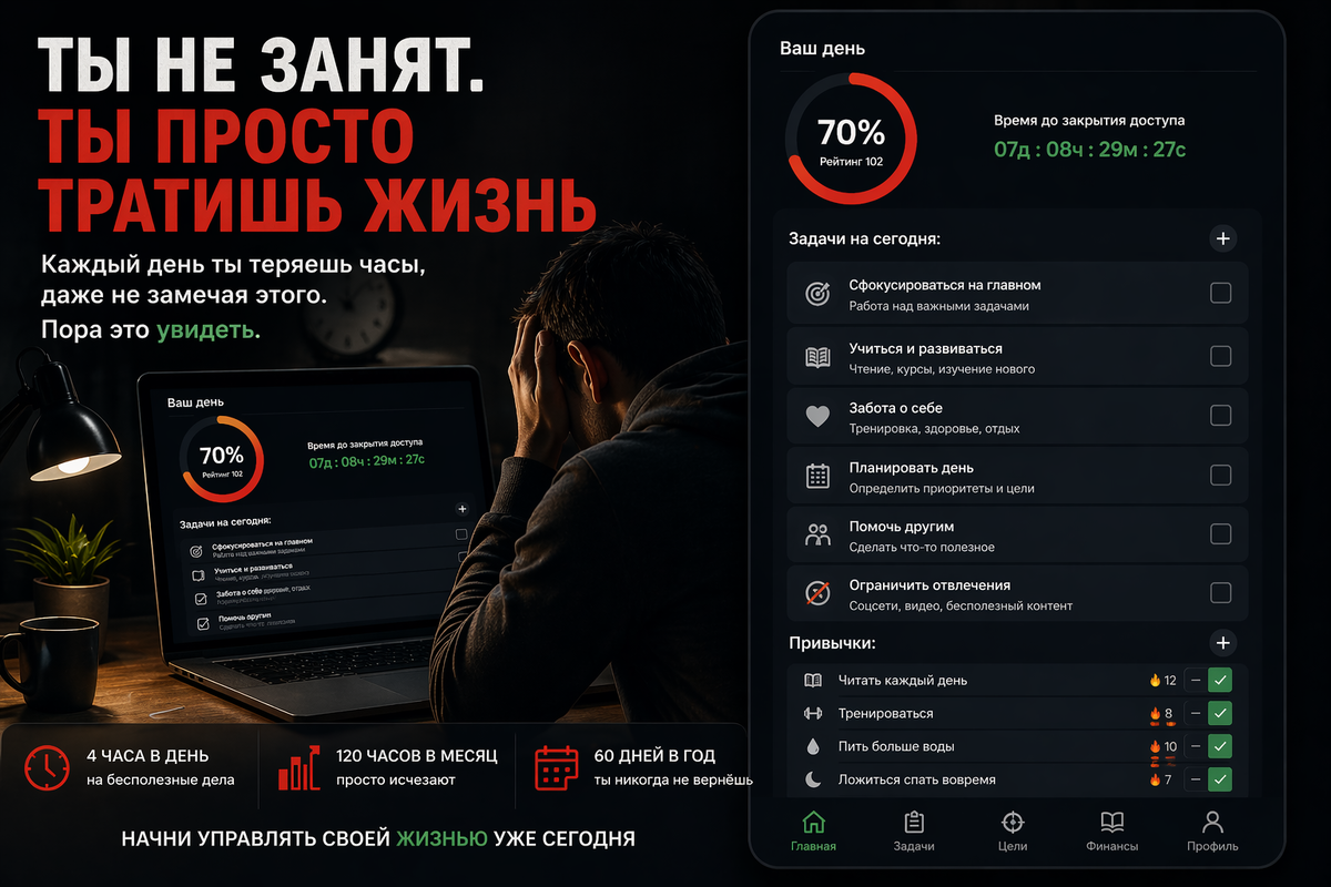 Что “сегодня не получилось”. Но если честно — ты не занят. Ты просто тратишь жизнь. Проснулся → телефон