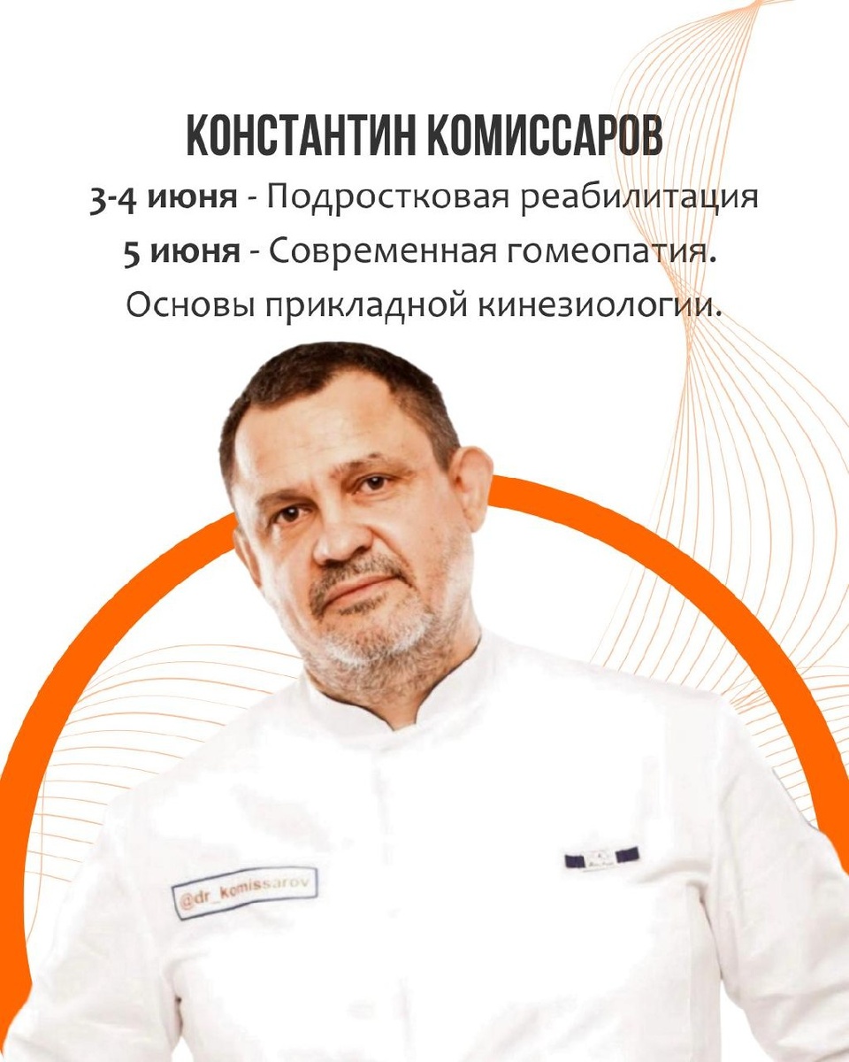 физической реабилитации доктора Комиссарова» и автора системы Babybuilding®. 3-4 июня - Реабилитация детей со сколиозом, кифозом и другими ортопедическими нарушениями Вы разберёте: Разницу между нарушением осанки и сколиозом Дисплазию и другие частые состояния у детей Нарушение осанки (сколиотическая и кифотическая) Сколиоз Кифоз (болезнь Шейермана-Мау) Последствия компрессионного перелома позвоночника Боль в спине и поиск её причин Что освоите на практике: Алгоритм осмотра ребёнка и составление «паспорта осанки» Корректирующий массаж с учётом зон напряжения Кинезиологические техники и фазическая гимнастика при болях и нарушениях осанки Метод фазической постизометрической релаксации (ПИР) Мягкие мобилизационные техники Рекомендации для родителей + правила ортопедического режима (дом, школа, после травм, профилактика) Семинар даёт чёткую диагностику и рабочие инструменты коррекции опорно-двигательного аппарата у детей. 5 июня - Современная гомеопатия. Основы прикладной кинезиологии. М