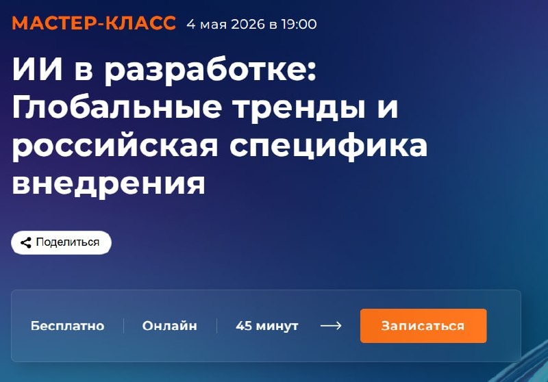 4 мая в 19:00 будет актуальный бесплатный мастер-класс "ИИ в разработке: Глобальные тренды и российская специфика внедрения"