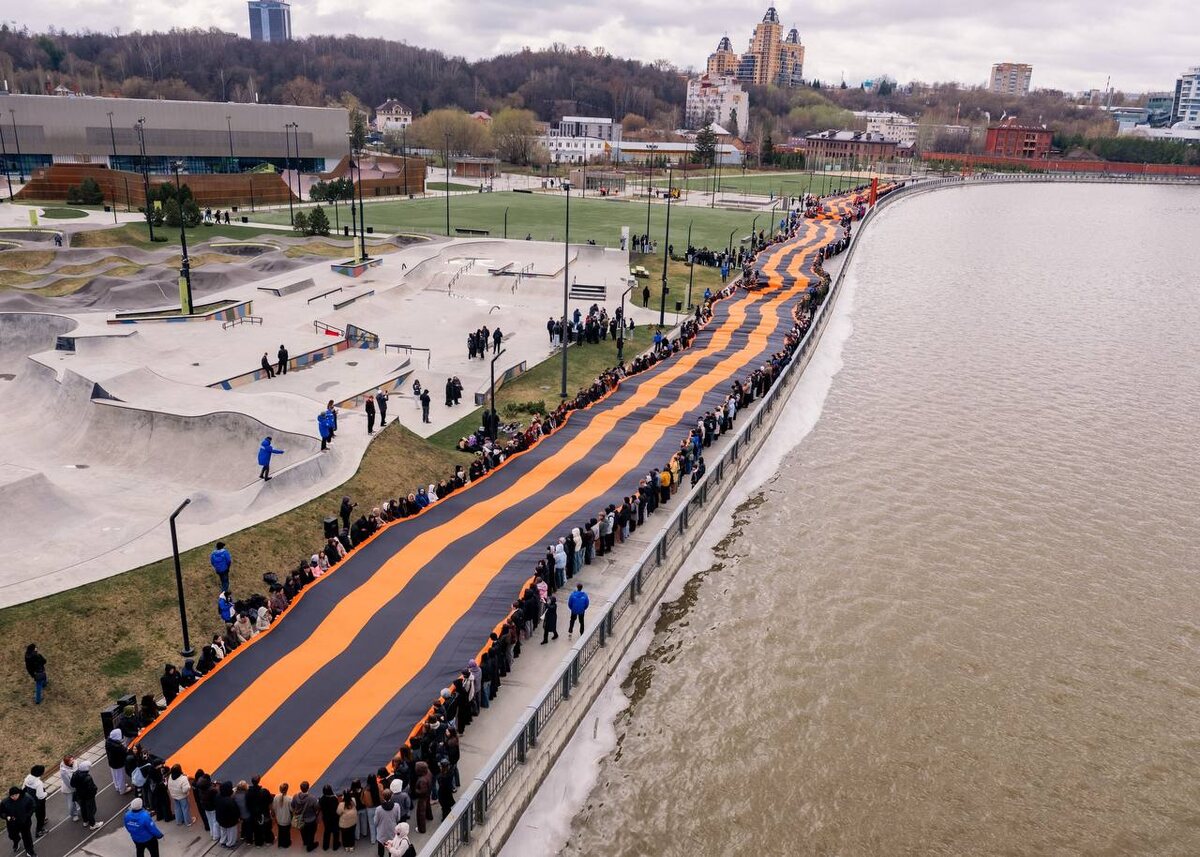 🇷🇺 Совместно с «Молодой Гвардией РТ» церемония развертывания самой протяженной в России Георгиевской ленты состоялась 22 апреля на Кремлевской набережной у экстрим-парка «УРАМ». Мероприятие дало старт ежегодной Всероссийской акции «Георгиевская ленточка» на территории Республики Татарстан. В акции приняли участие более 800 человек. К развертыванию 300-метрового полотна были привлечены активисты Татарстанского регионального отделения ВОО «Молодая Гвардия Единой России», студенты высших и средних специальных учебных заведений Казани, учащиеся школ, представители общественных объединений и жители города. Всероссийская акция «Георгиевская ленточка» продлится на территории Российской Федерации до 9 мая 2026 года. В указанный период волонтеры будут распространять ленты как символ памяти о Победе в Великой Отечественной войне⭐ 💬Мы в MAX
