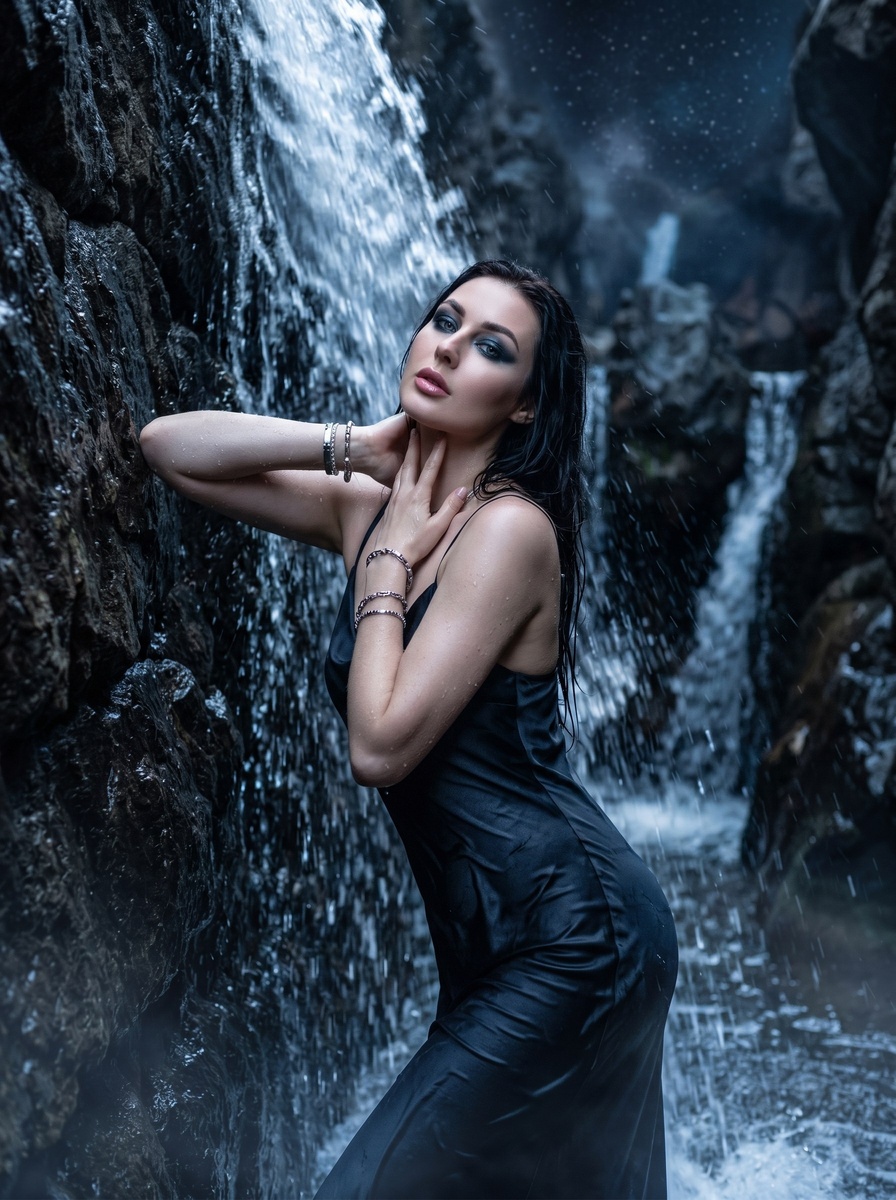 Представьте: вы везете команду в узкий горный каньон. Заставляете модель часами стоять под ледяным водопадом в мокром шелковом платье. Визажист в панике пытается спасти макияж от потеков, а фотограф судорожно ловит фокус сквозь водяную пыль. Итог — простуда всей съемочной группы и счет за выездной продакшен с пятью нулями. Но для рекламной кампании водостойкой косметики, серебряных украшений или лукбука одежды такой кадр часто необходим прямо сейчас. Теперь подобные задачи без лишней драмы закрывает Nano Banana 2 (Gemini 3.1). Вы получаете коммерческий фэшн-глянец без риска для здоровья команды и бюджета заказчика. Секрет реализма здесь кроется в жестких технических параметрах. В запросе четко задан объектив 50 mm, кинематографичная цветокоррекция в холодных тонах и зеркальные блики на мокрой ткани. Нейросеть отлично держит заданные рамки: «глаза выполнены в технике смоки айс в серо-синих оттенках... губы покрыты розовым блеском». Под реальным водопадом так не бывает, а здесь косметика