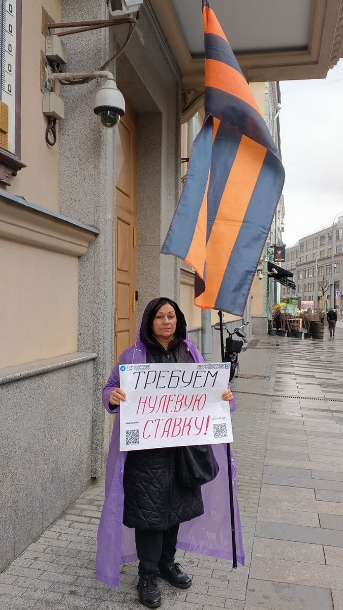 «Завтра будет заседание совета директоров Центрального банка, на котором будет приниматься решение о ставке. На наш взгляд, было бы правильным более радикально действовать здесь и снизить ставку на 1 п.п., а не идти маленькими шажками по 0,5 п.п.», — заявил глава Российского союза промышленников и предпринимателей в ходе расширенного заседания координационного совета отделений РСПП в Сибирском федеральном округе. На фото: ежедневный одиночный пикет НОД у здания Центробанка в Москве с требованием нулевой ставки для развития экономики России. 23 апреля 2026 года. @belrusinfo