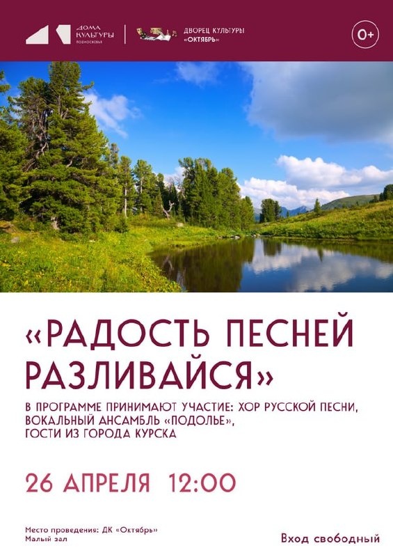 ✨ Приглашаем 26 апреля в ДК "Октябрь" Для Вас выступят хор русской песни "Подолье" г. Курск и хореографические коллективы🩰 🚫 Возраст: 0+ 📆 26.04.2026 🕒 12:00 🏢 Дворец культуры «Октябрь» 📍 г. Подольск, ул. Свердлова, д.38 💰 Вход свободный❗️ ⭐Поддержать канал голосом 🍰Где поесть в Подольске ✅ Мероприятия Подольск https://dzen.ru/id/66ed500f7b5671493eca3fd6 https://vk.ru/podolsk_events http://dzen.ru/podolsk_events