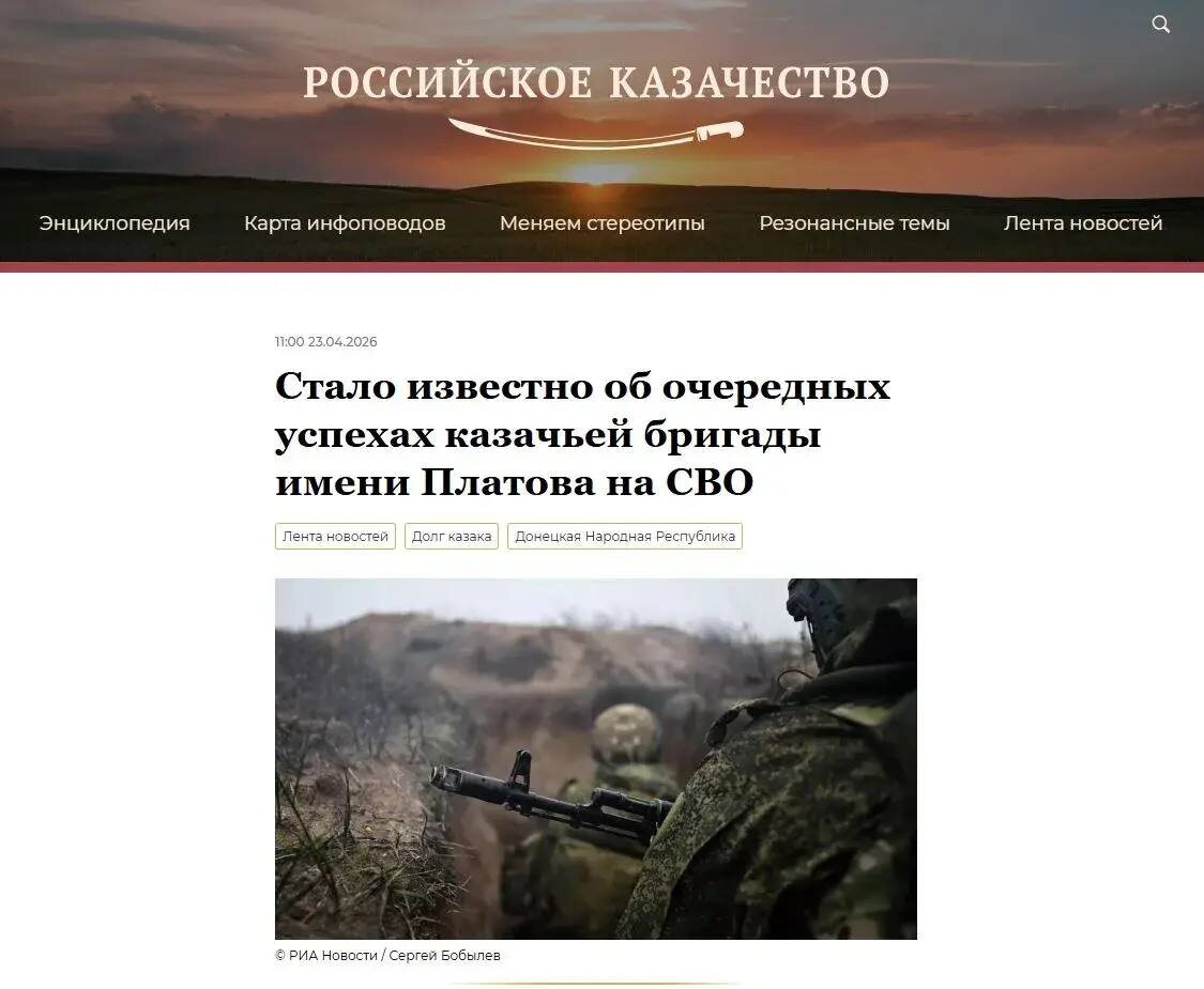 Казачья бригада имени Платова доложила об уничтожении 35 дронов ВСУ, складов боеприпасов и вражеской инфраструктуры за апрель 6-я отдельная гвардейская мотострелковая Лисичанская казачья бригада имени М.И. Платова продолжает успешное выполнение боевых задач в зоне проведения специальной военной операции. Как сообщили в соцсетях 3-й общевойсковой армии ВС РФ, особенно отличились подразделения бригады на Славянско-Краматорском направлении в районе населенного пункта Каленики в ДНР. Благодаря казакам бригады потери ВСУ за апрель составили: -35 беспилотных летательных аппаратов; -11 укрытий с живой силой; -10 пунктов управления БПЛА; -8 складов боевой комплектации; -5 полевых складов; -4 блиндажа; -4 антенны управления дронами; -2 наземных робототехнических комплекса); -1 терминал спутниковой связи Starlink; -1 бронемашина. О буднях и подвигах казаков можно почитать на сайте Российского Казачества.