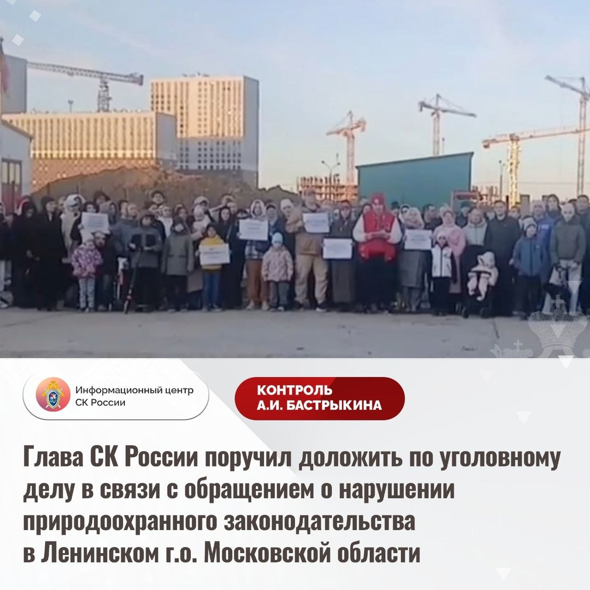 о. Московской области В сети Интернет размещено видеообращение жителей Ленинского городского округа Московской области к Председателю СК России А.И. Бастрыкину по вопросу нарушения их прав. В настоящее время вблизи жилых домов без проведения общественных слушаний осуществляется возведение мусороперегрузочной станции. Отмечается, что размещение данного объекта ухудшит экологическую обстановку, приведёт к выбросам вредных веществ и распространению неприятного запаха. Обращения в компетентные органы результатов не принесли. В ГСУ СК России по Московской области расследуется уголовное дело. Председатель Следственного комитета Российской Федерации Александр Иванович Бастрыкин поручил руководителю ГСУ СК России по Московской области Ярославу Александровичу Яковлеву представить доклад о предварительных и окончательных результатах расследования уголовного дела, а также проводимой работе по разрешению озвученной в видеообращении проблемы граждан. Исполнение поручения поставлено на контроль