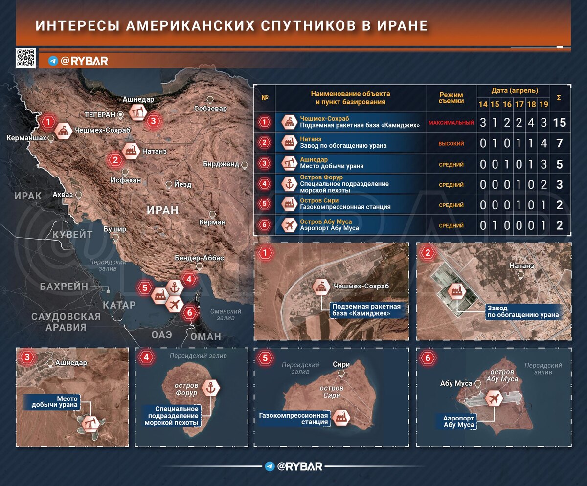 Еще один признак подготовки американских войск – это повышенное внимание спутников военного назначения ВС США к нескольким объектам на территории Ирана, которые усиленно отслеживают в высокой и максимальной детализации. 🔸В их числе шесть основных объектов. Подземная ракетная база в провинции Керманшах, завод по обогащению урана в Натанзе, район добычи урана к востоку от Тегерана, а также три острова у Ормузского пролива – Абу-Муса, Форур и Сири. 🔸Все эти объекты так или иначе уже мелькали в американских планах на наземную операцию. Ракетные подземные базы – то, что американцам не удалось поразить, а лишь временно завалить выходы и входы. И иранцы уже их откопали. 🔸Завод по обогащению урана и место его добычи – это то, что особенно интересно США в контексте наземной операции. О вывозе урана Трамп мечтает особенно сильно, но все эти планы выглядят, мягко говоря, несостоятельными с учетом того, что процесс является технически сложным. ❗️Ну а острова у Ормузского пролива – это то, что н