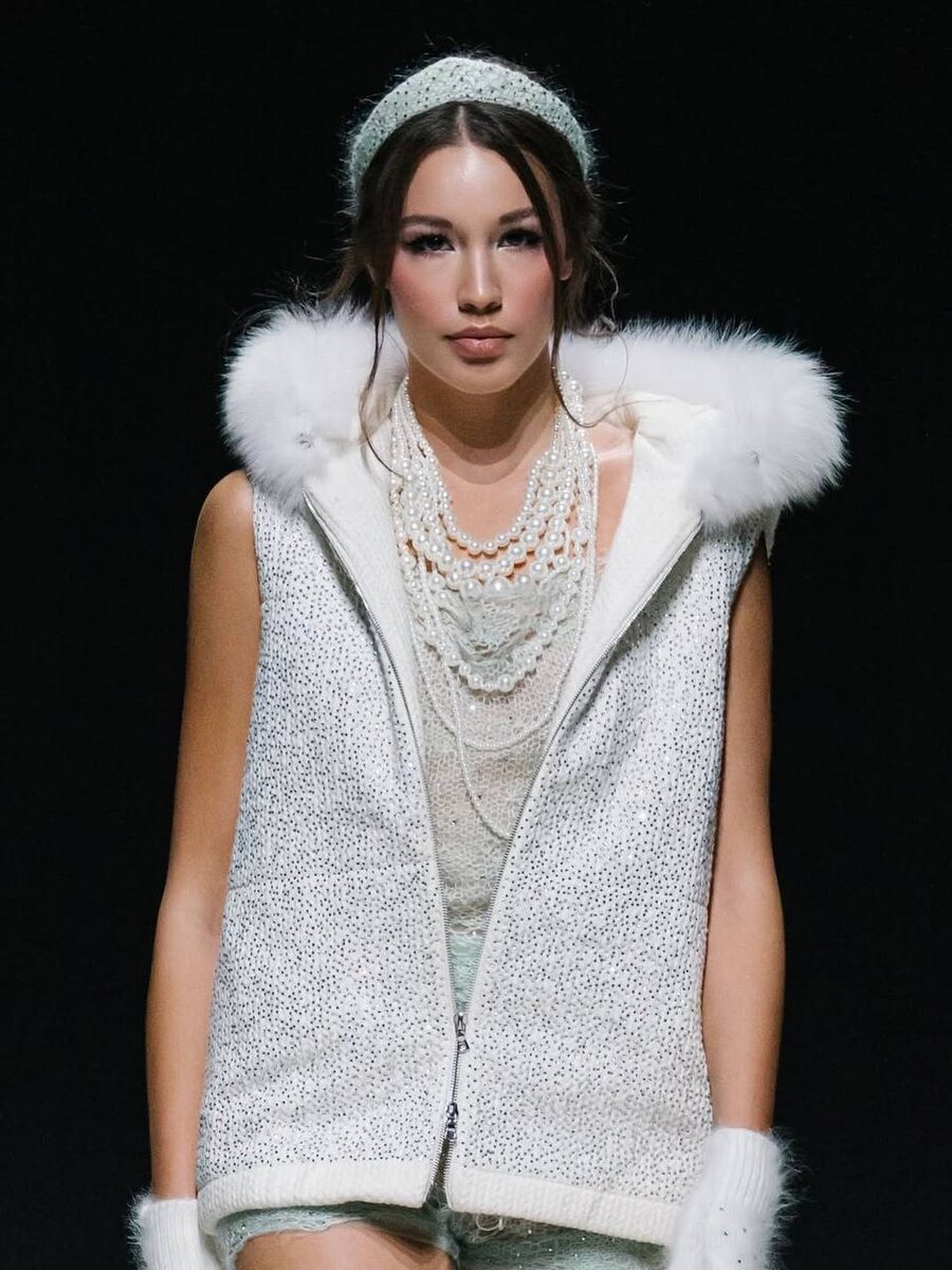 Современный зимний образ с ноткой игривого стиля: объёмная жилетка с меховой отделкой и перчатки создают ощущение тепла и уюта. Акцент на многослойных жемчужных украшениях добавляет образу женственности, а украшенный кристаллами кокошник в цвет костюма из пухового кружева вносят лёгкую элегантность. Белоснежные ботинки с мехом завершают лук, превращая его в стильный вариант для городских холодов.