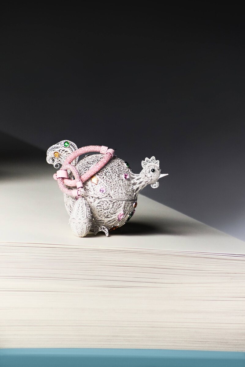 Сумка «Курочка» от Ульяны Сергиенко, выполненная в технике филиграни, украшенная деталями из гусевского хрусталя, с подвеской в форме яйца
