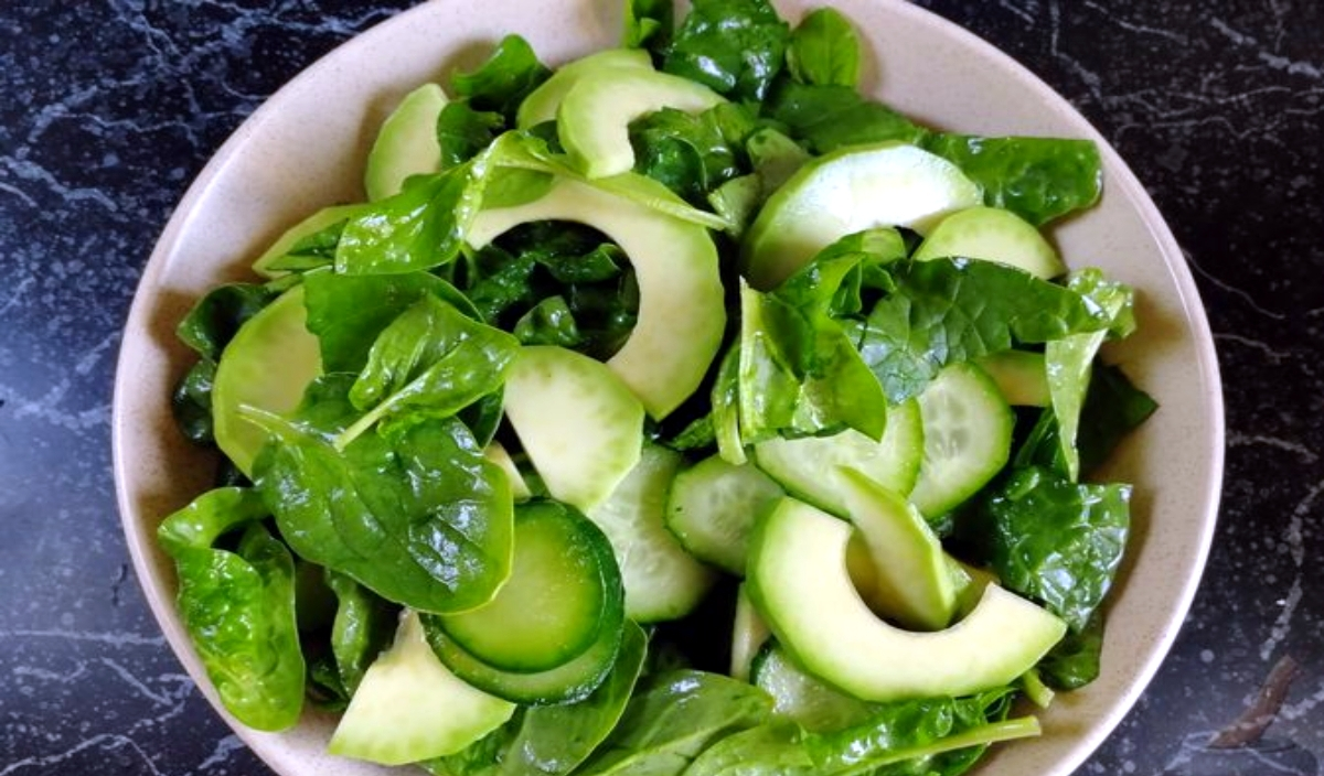 Выкладываю в салатницу зелень, сверху — огуречные ленточки и авокадо. Поливаю заправкой и аккуратно (двумя ложками) перемешиваю, чтобы авокадо не превратилось в кашу.